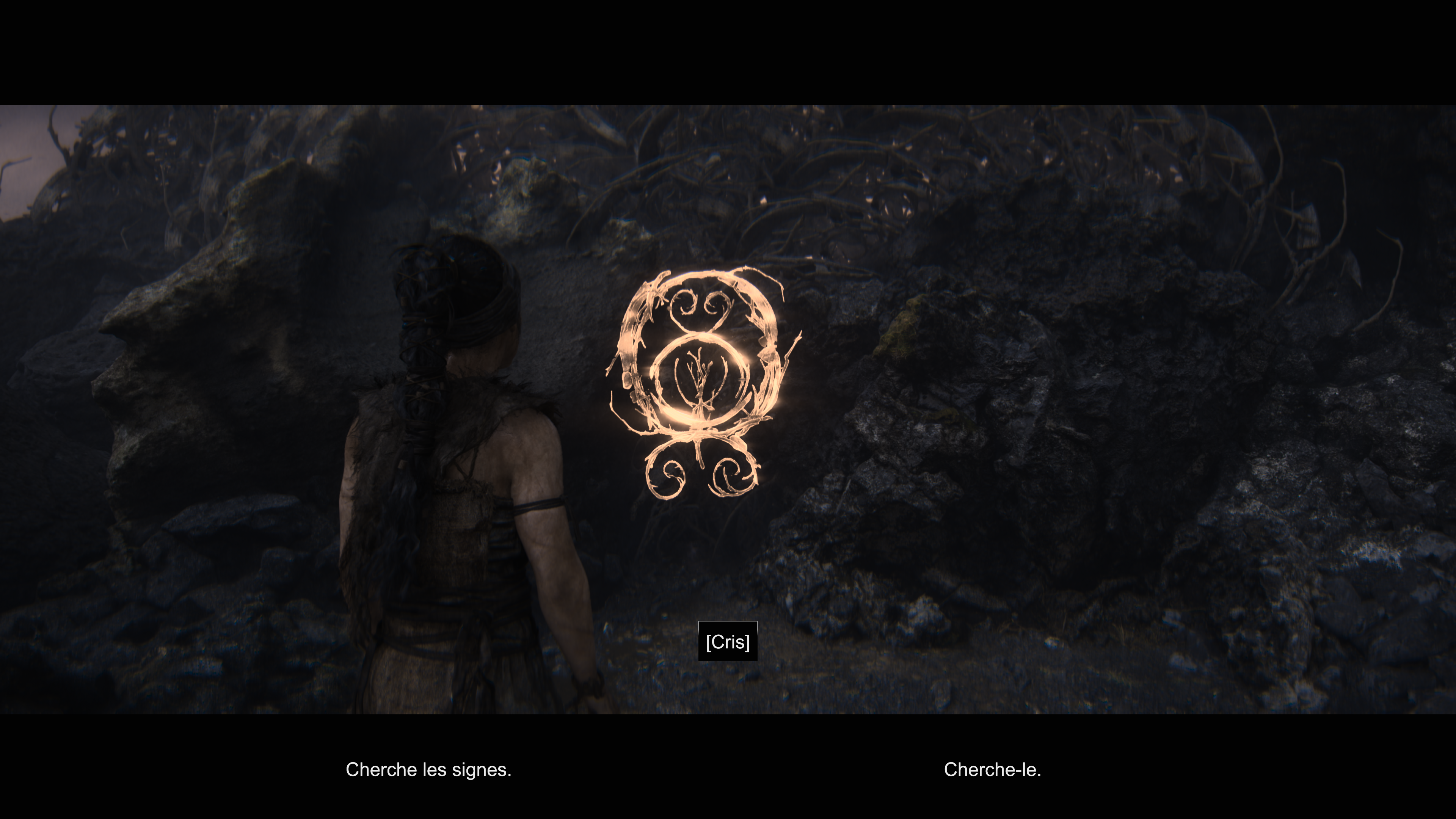 Beware, too, of Senua’s particularity: she constantly hears voices. The voices talk a lot and come from many overlapping sources, both external and internal. These three different voices are placed in three clearly identified spots. Both internal voices comment on everything you do and alert you to dangers. They appear in the bottom banner of the screen, one on the left and the other on the right. Actual discussions with other characters are displayed in the subtitle box. So, that’s a lot of text to read at the same time. The internal voice subtitles are short and scroll through very quickly since there isn’t much room in the lower banner.