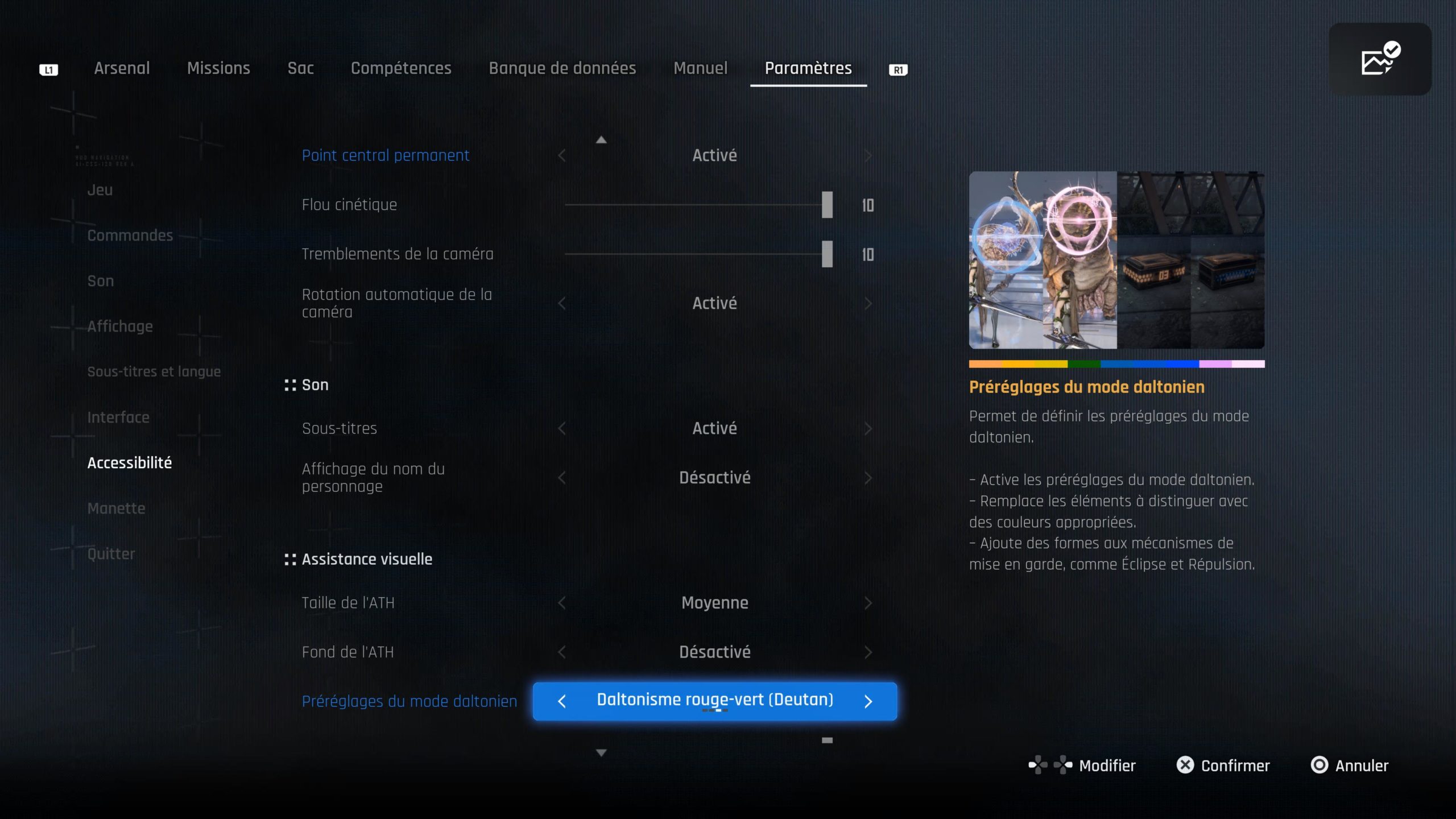 For motion sensitivity, you’ll find settings to adjust motion blur and sharpness. These can be found in the Display Menu, but there are also settings in the Accessibility Menu. In particular, there’s a central point displayed on-screen, Eve always being slightly to the left. This point is very small but will still allow you to focus.