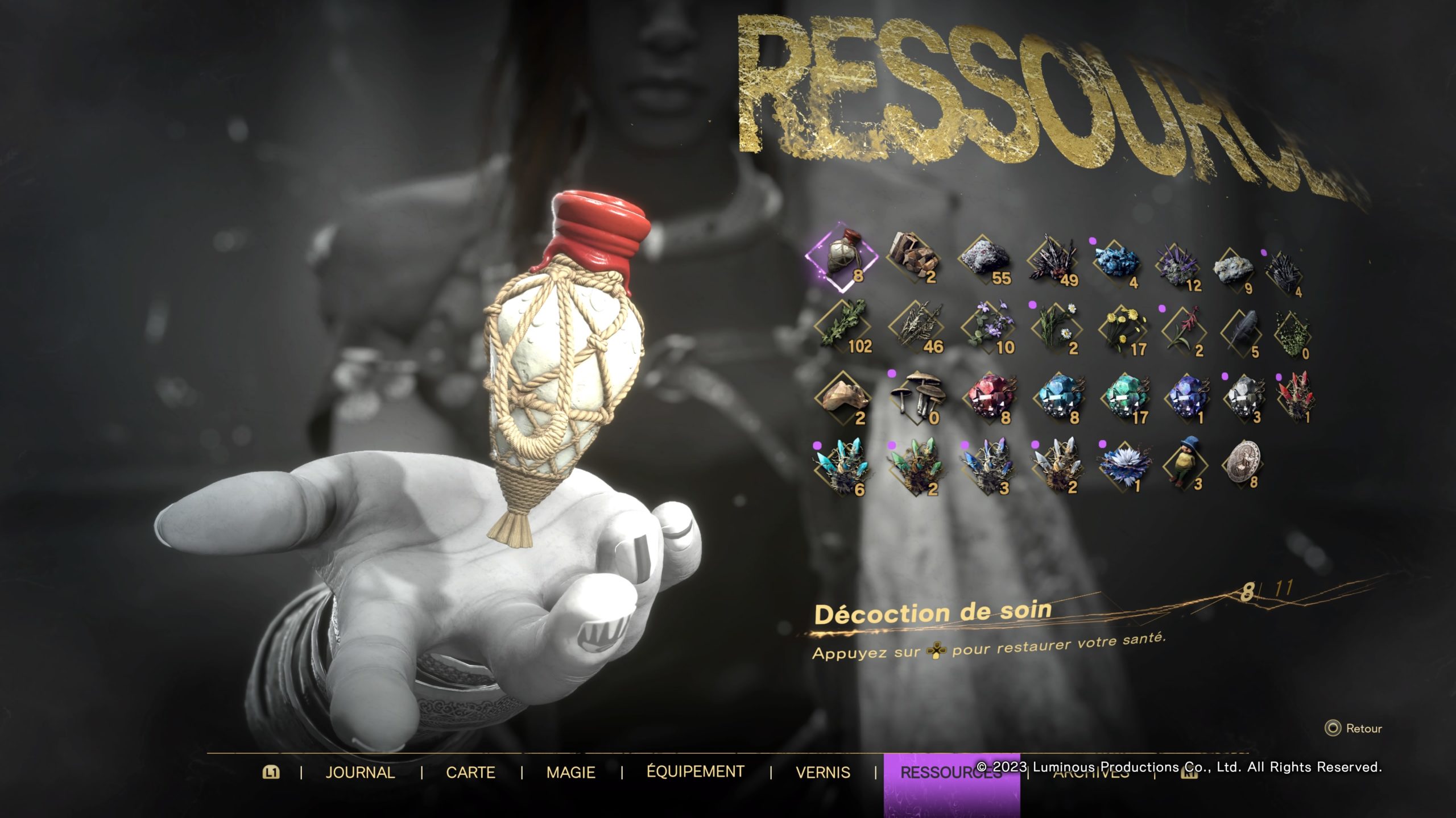 Côté matériel, vous allez ramasser des tonnes de ressources à combiner. Soit directement dans vos objets, soit pour faire des ressources plus puissantes utilisées pour de meilleurs effets. Tout cela vous permet d’améliorer les caractéristiques et les effets de votre cape et votre collier, les deux principaux éléments de votre équipement.