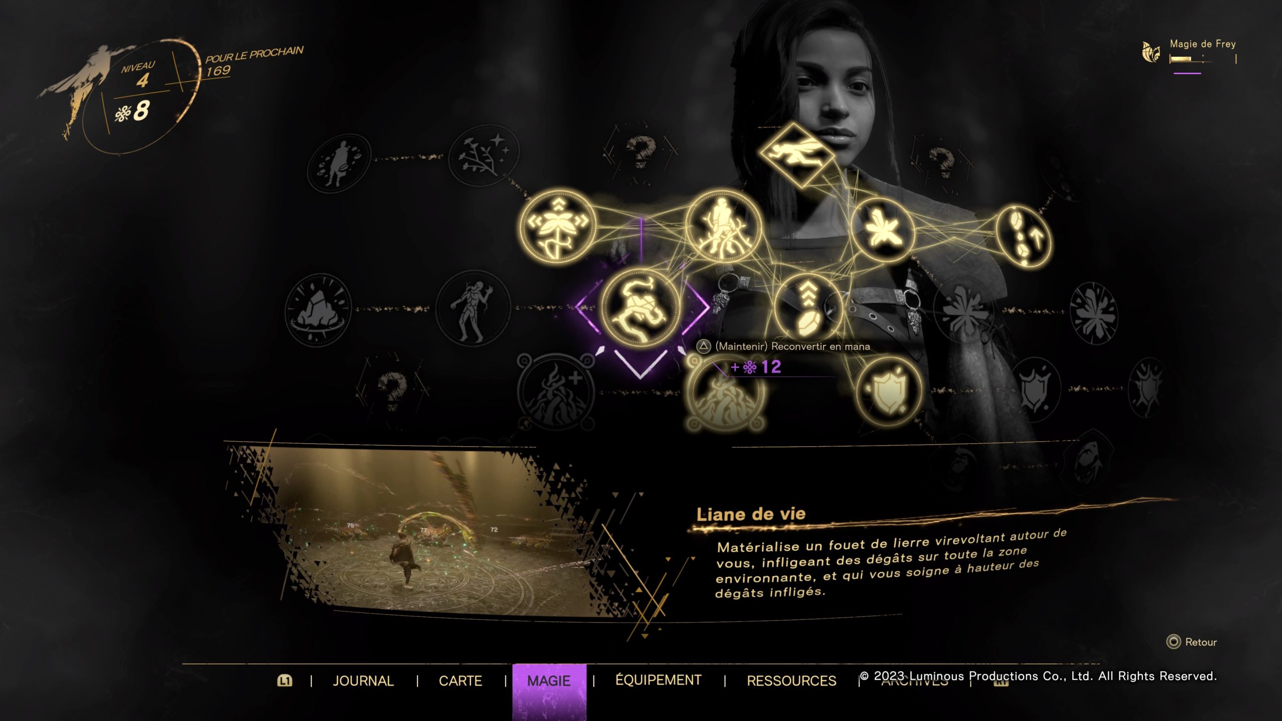 Frey améliorera ses capacités et son équipement. Vous aurez accès à une cinquantaine de sorts répartis en types de magie. Cela permet de varier les types de combat — distant ou corps à corps — et il vous faudra choisir la magie à laquelle chaque ennemi est sensible. Étonnamment, l’expérience gagnée en combat ne fera qu’augmenter passivement votre niveau et vos statistiques. Ce que vous contrôlez, c’est l’attribution des points de magie gagnés dans vos arbres de compétences, un par magie.