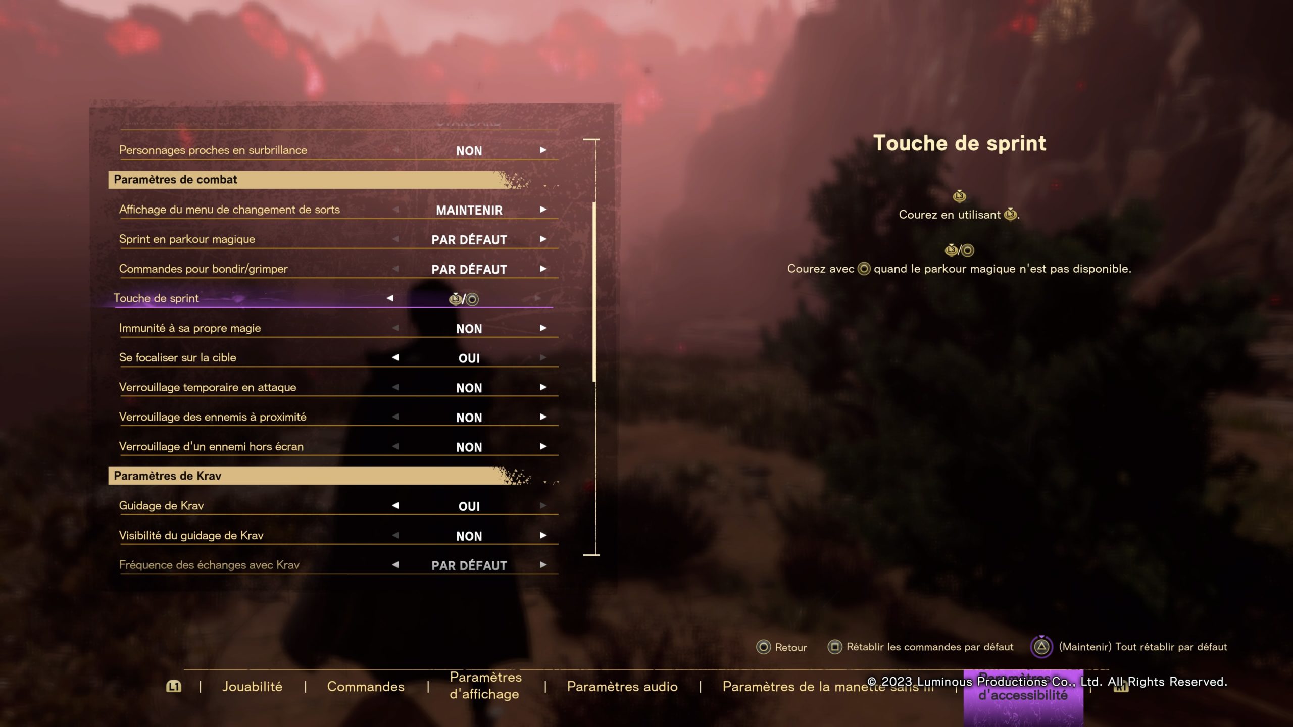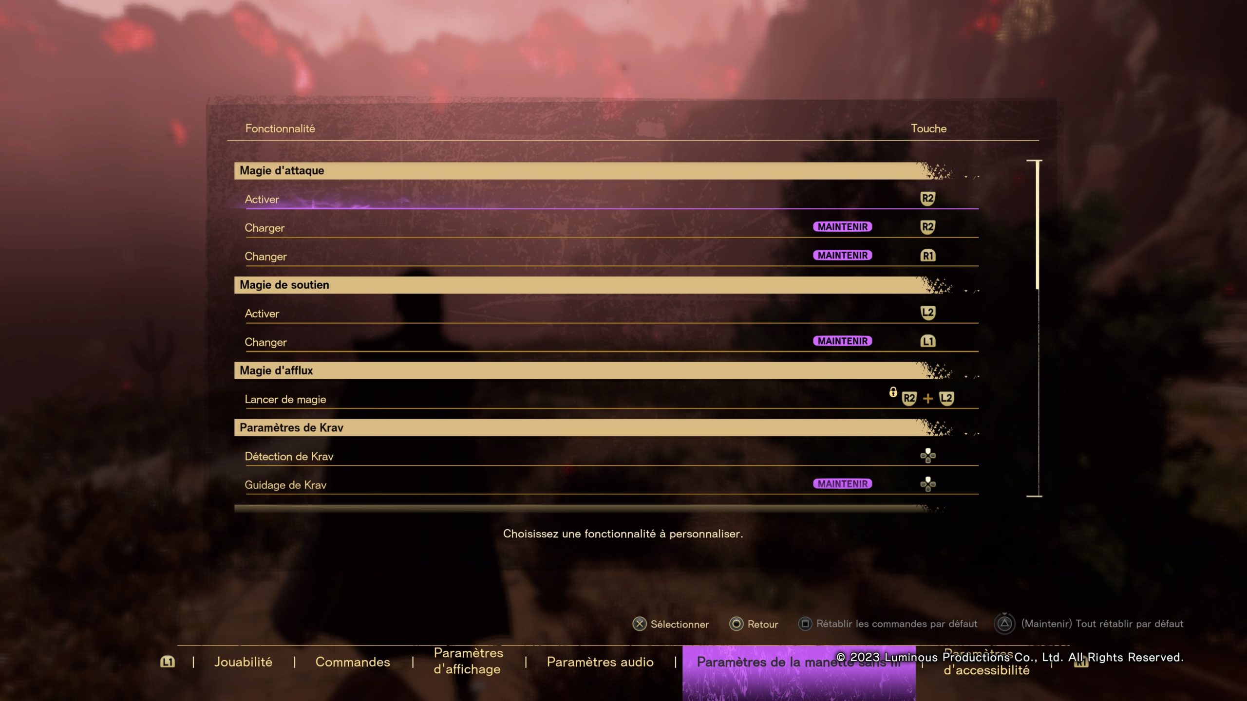 Le « lancer de magie » est effectivement fixe et ne peut être changé directement. Par défaut, il faut utiliser les deux gâchettes simultanément. Mais, si vous changez les composants de cette action, alors la combinaison se met à jour. Donc si on attribue « Croix » à l’attaque (au lieu de R2) et « Rond » au soutien (au lieu de L2), il faut appuyer simultanément sur « rond + croix » pour le « lancer de magie ».