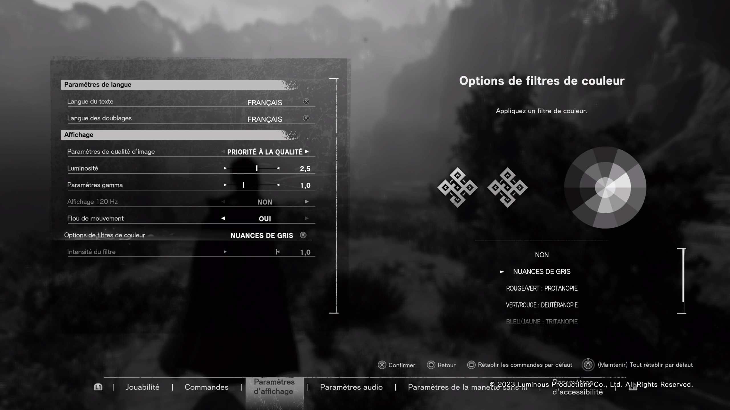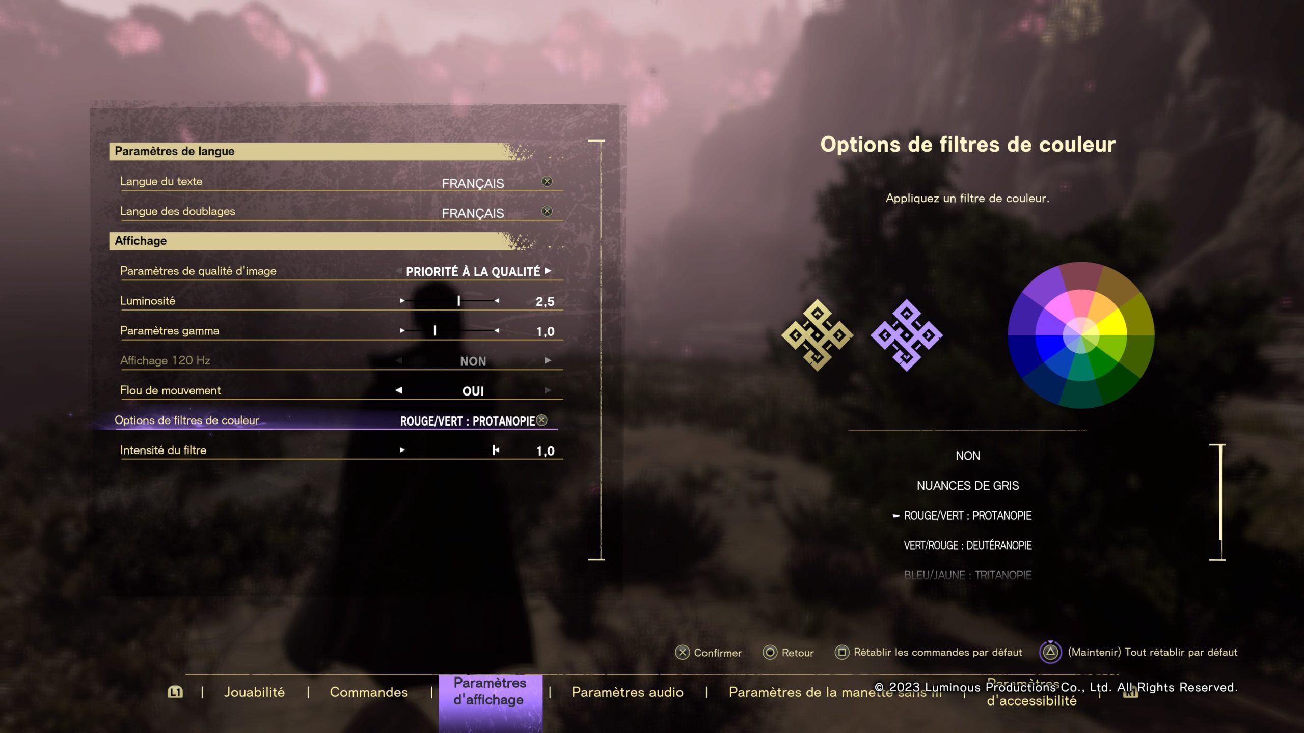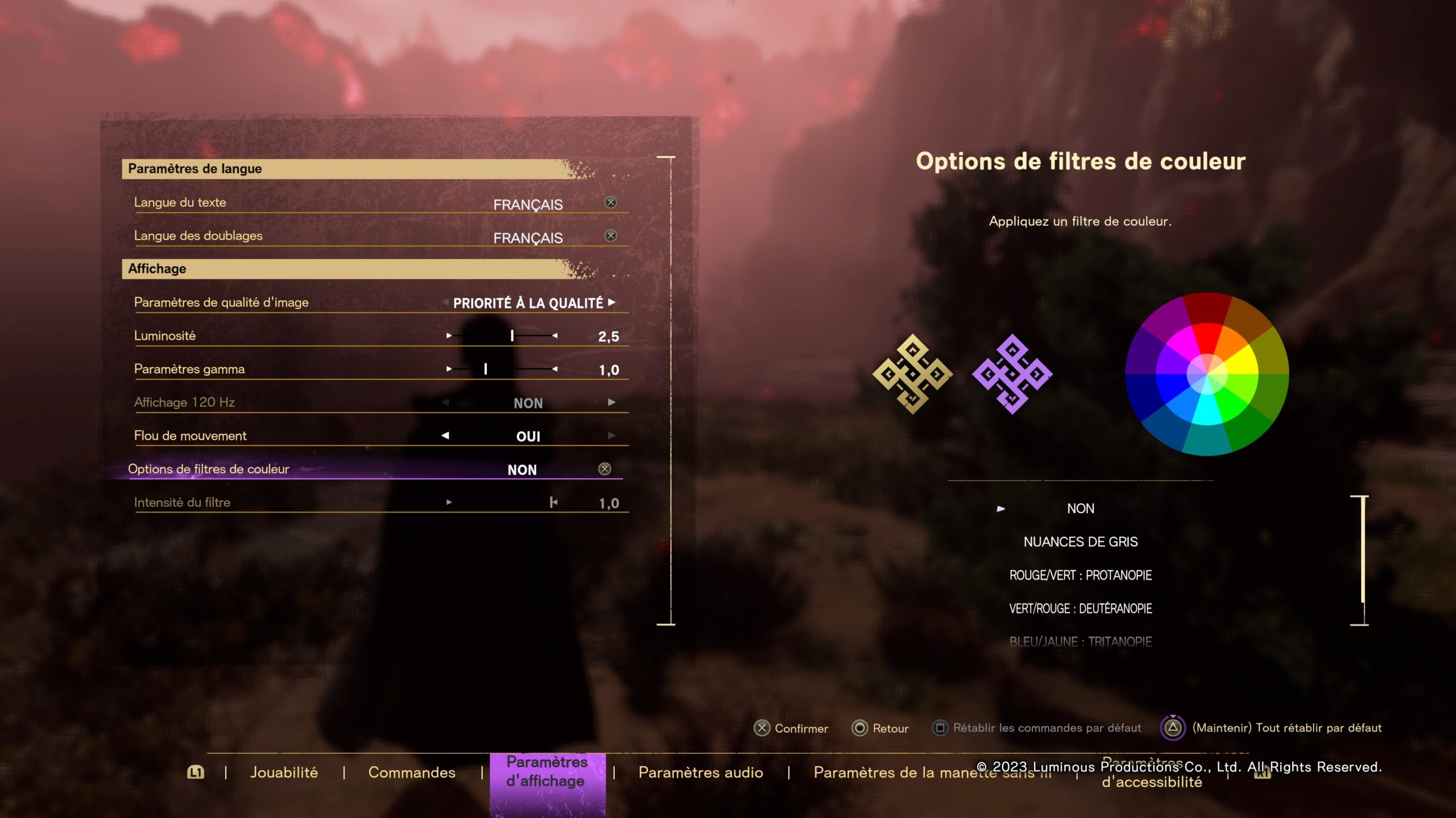 On peut déjà remarquer que les couleurs d’interface dominantes sont le jaune et le violet. Un choix intéressant puisqu’une grande partie des personnes atteintes de daltonisme vont pouvoir l’utiliser sans de grosses modifications. Cependant, il existe dans les options la possibilité d’ajouter un filtre de couleur sur les trois types de daltonisme et en nuances de gris pour les joueurs atteints d’achromatopsie. On peut régler la force de filtre finement en voyant son effet sur les icônes du menu et une palette de couleur.