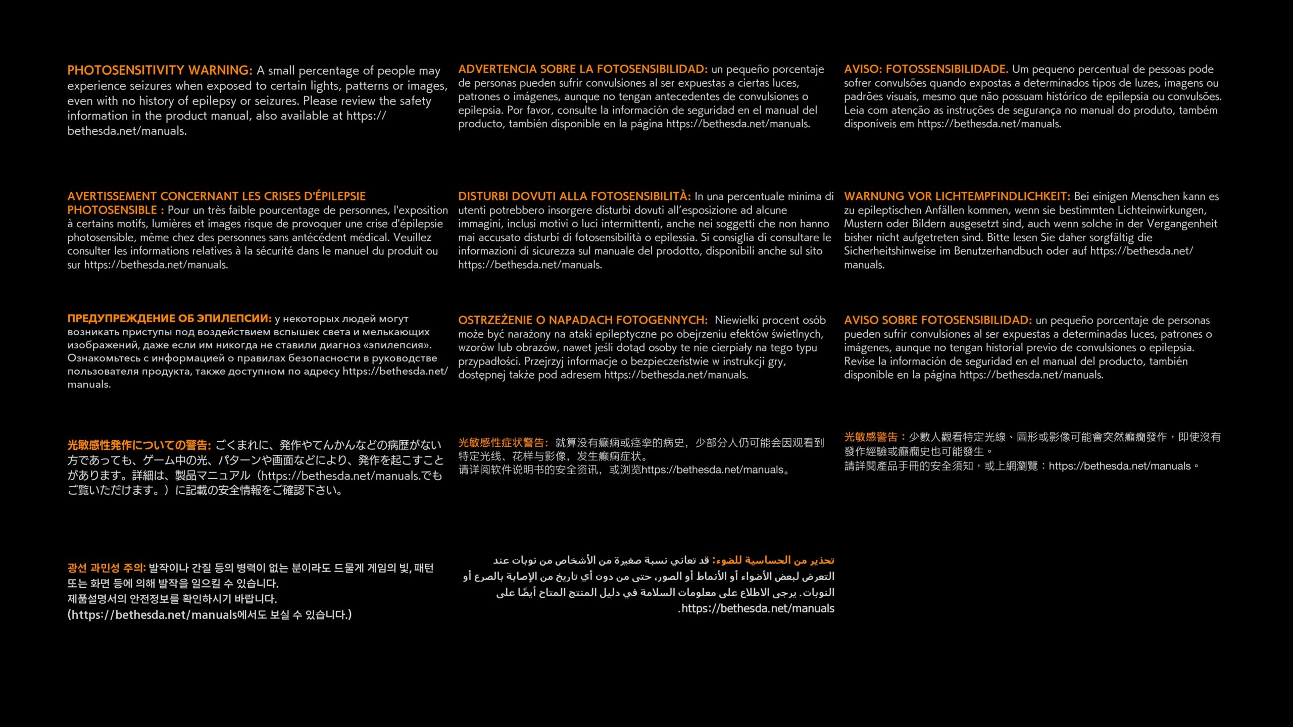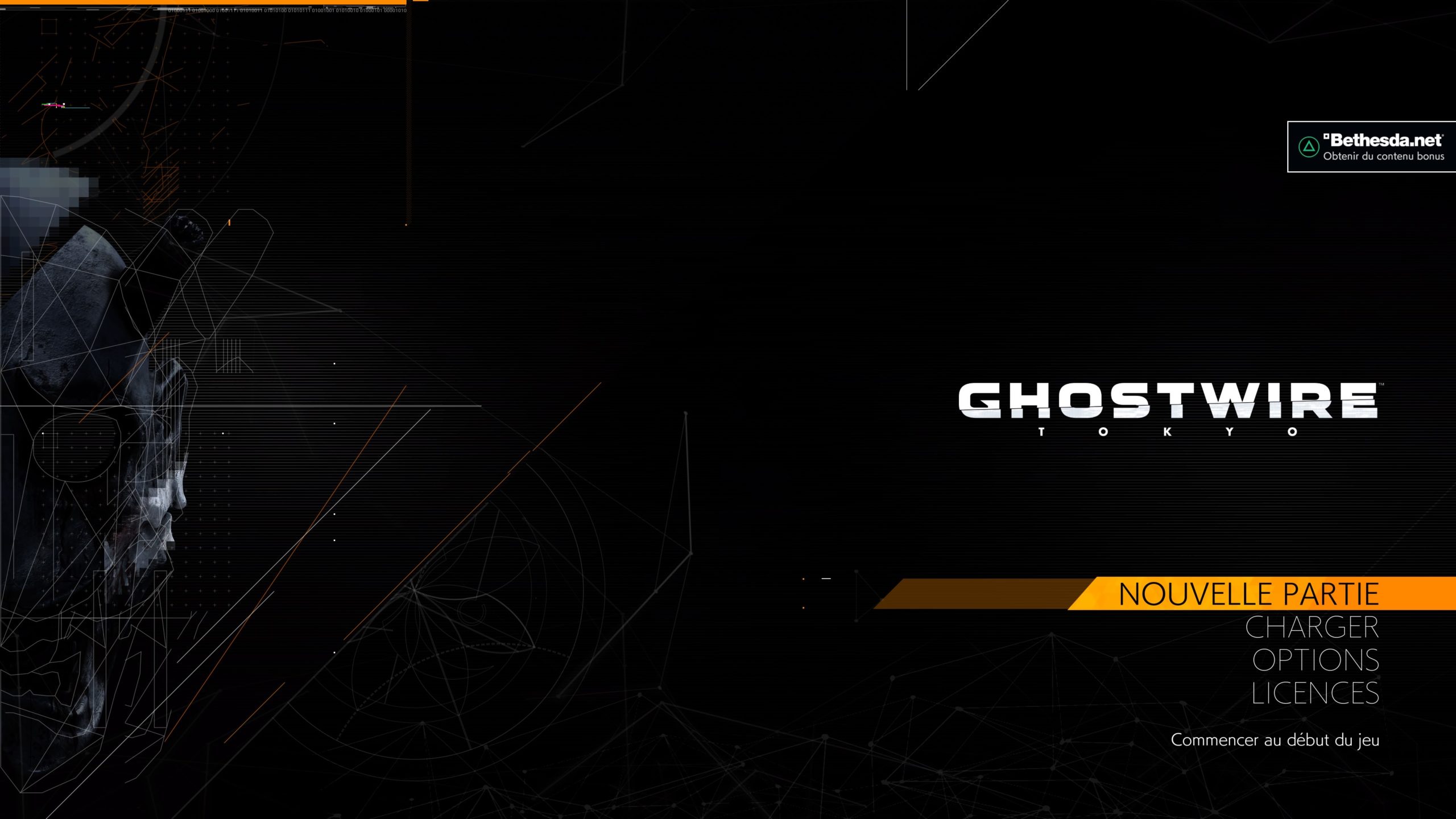 On retrouve encore beaucoup d’écrits dans les jeux, et sur « Ghostwire : Tokyo » et on est gâté d’entrée. Ce magnifique texte multi langue illisible vous préviens des risques d’épilepsie. Le menu est écrit. Il n’y a pas d’indicateur visuel du contenu. Cependant, une bande orange met en avant l’élément sélectionné. Par défaut on est sur « Continuer » ou « Nouvelle Partie » pour reprendre là où on en était.