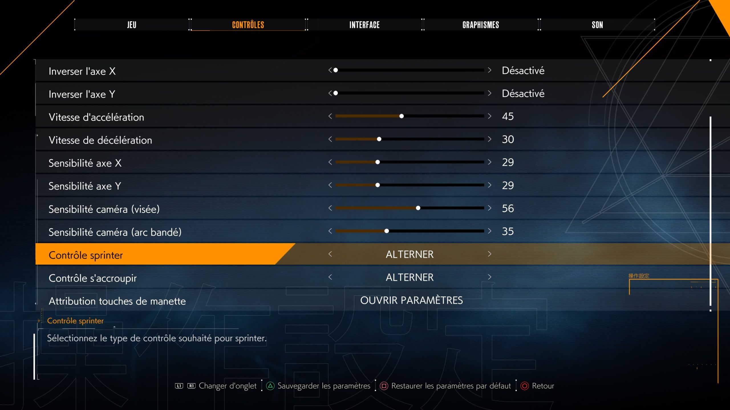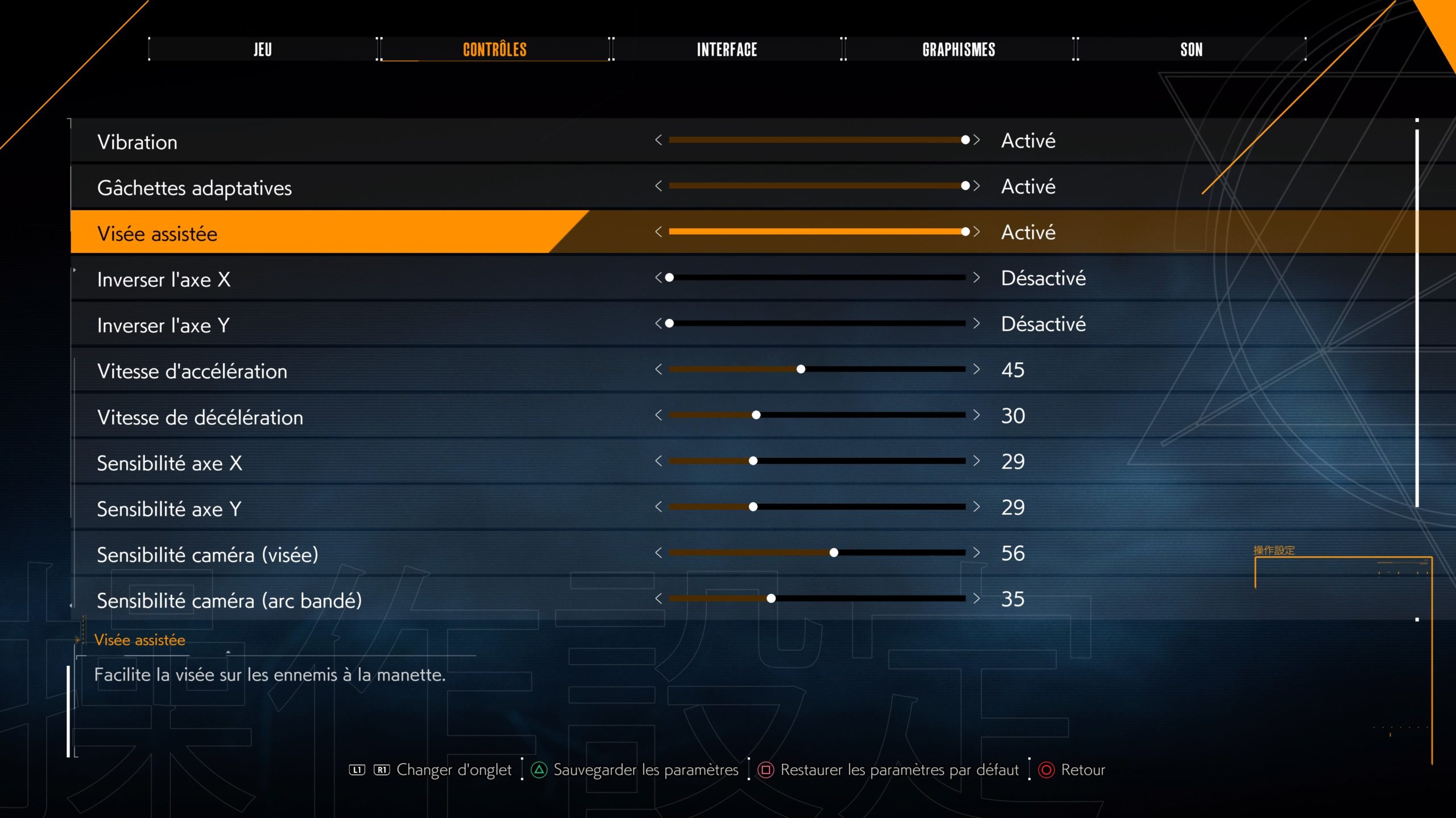 C’est un jeu PS5, donc on y retrouve les réglages spécifiques : les vibrations et le retour haptiques des gâchettes qui peuvent être désactivés ou régler pour la fatigabilité des doigts. D’ailleurs, on retrouve également le choix entre activation et maintien de la touche pour s’accroupir ou courir. Cela devrait soulager la fatigue musculaire. Dommage qu’il n’y ait pas l’option pour la visée, c’est très utilisé et fatigant à force.