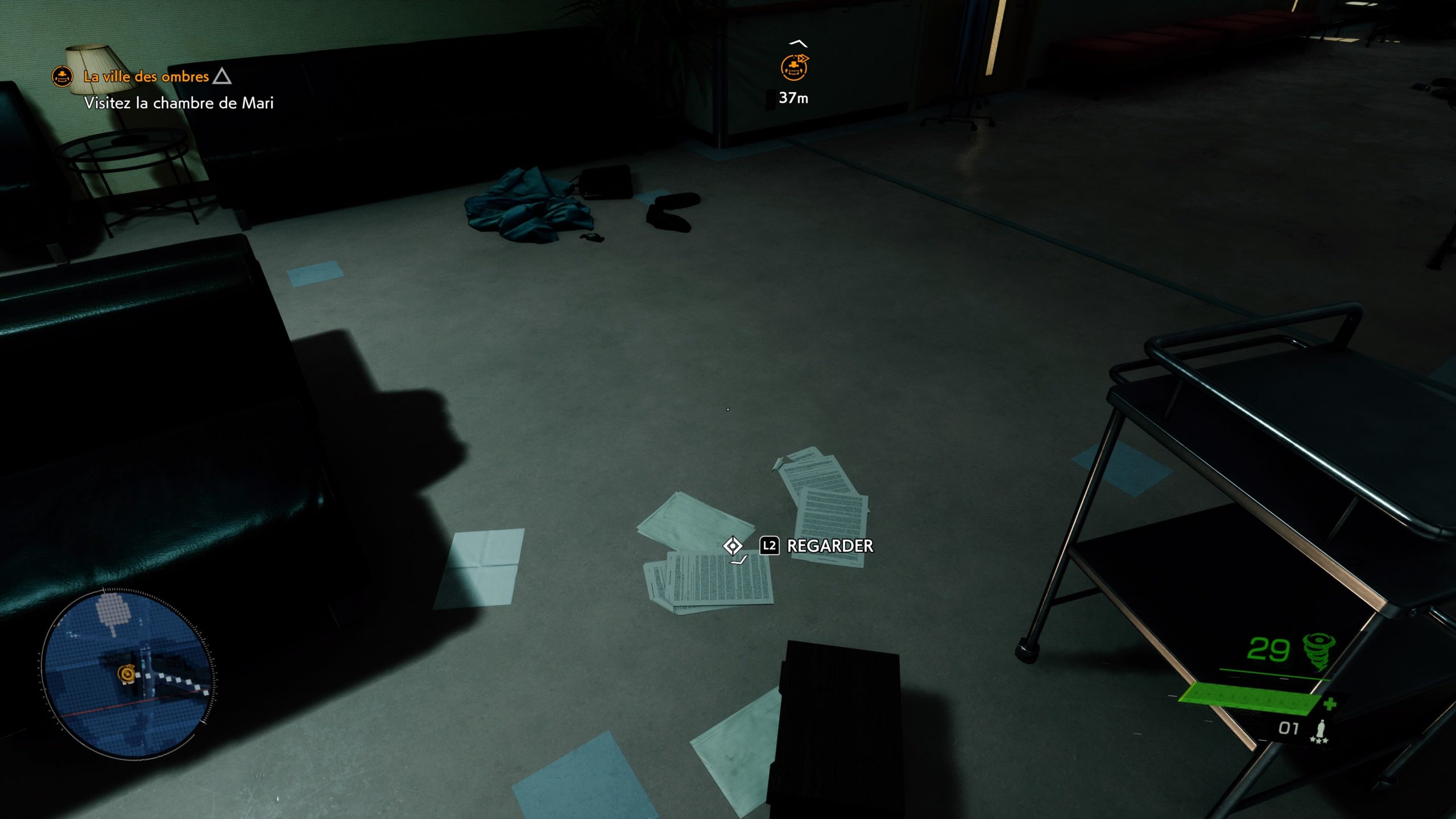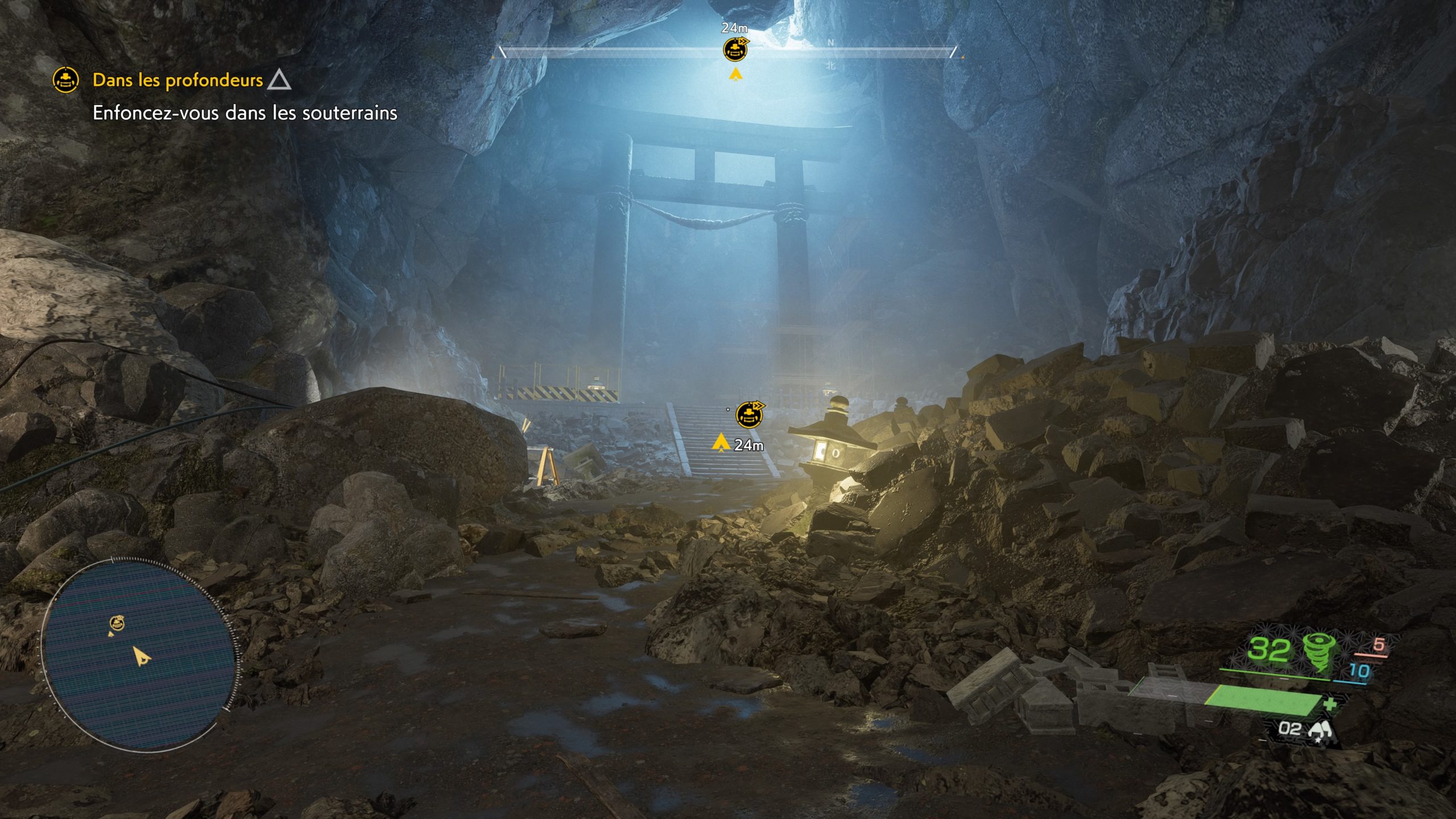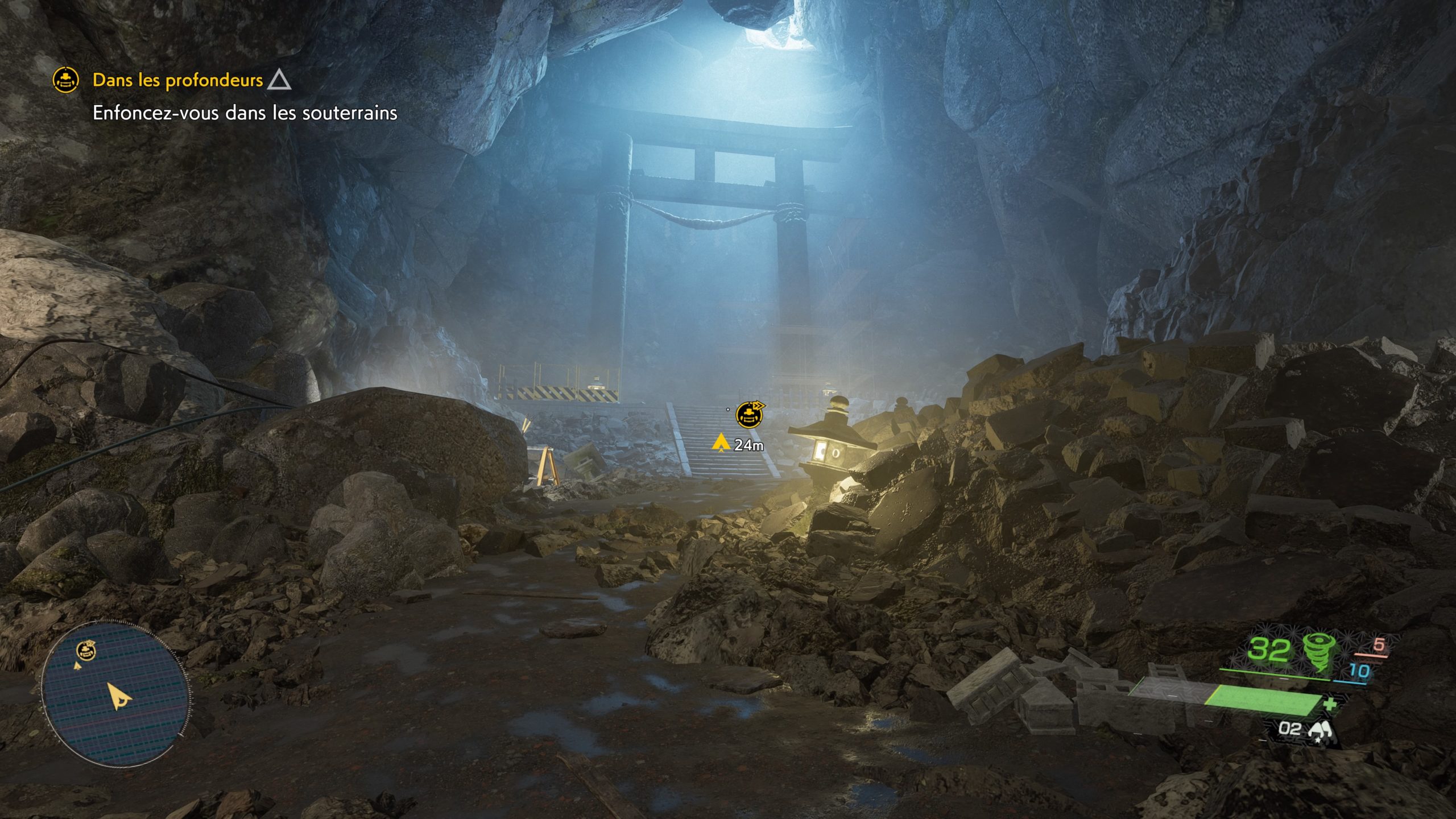 C’est en ligne droite comme on le voit, mais en tenant compte des obstacles. Très utile donc pour se repérer. La mini carte vous aidera également à vous représenter les lieux en 2D. C’est souvent réclamé par les joueurs. Vous pouvez l’agrandir pour une meilleure lecture. Le jeu propose également une boussole en haut d’écran en complément ou à la place de cette carte. Mais c’est moins compréhensible en général pour nos testeurs.