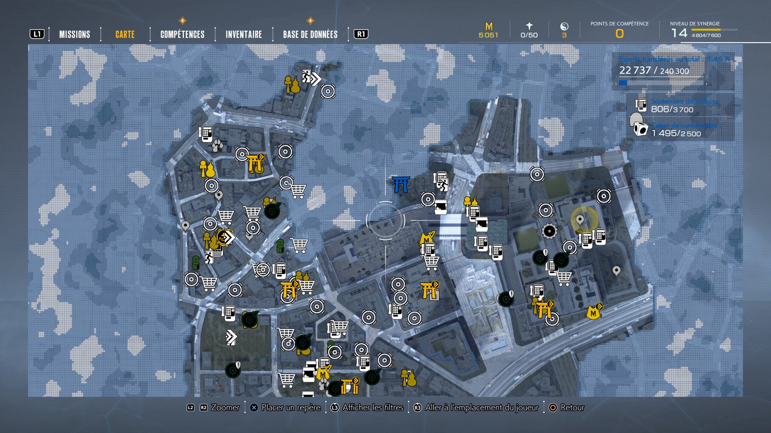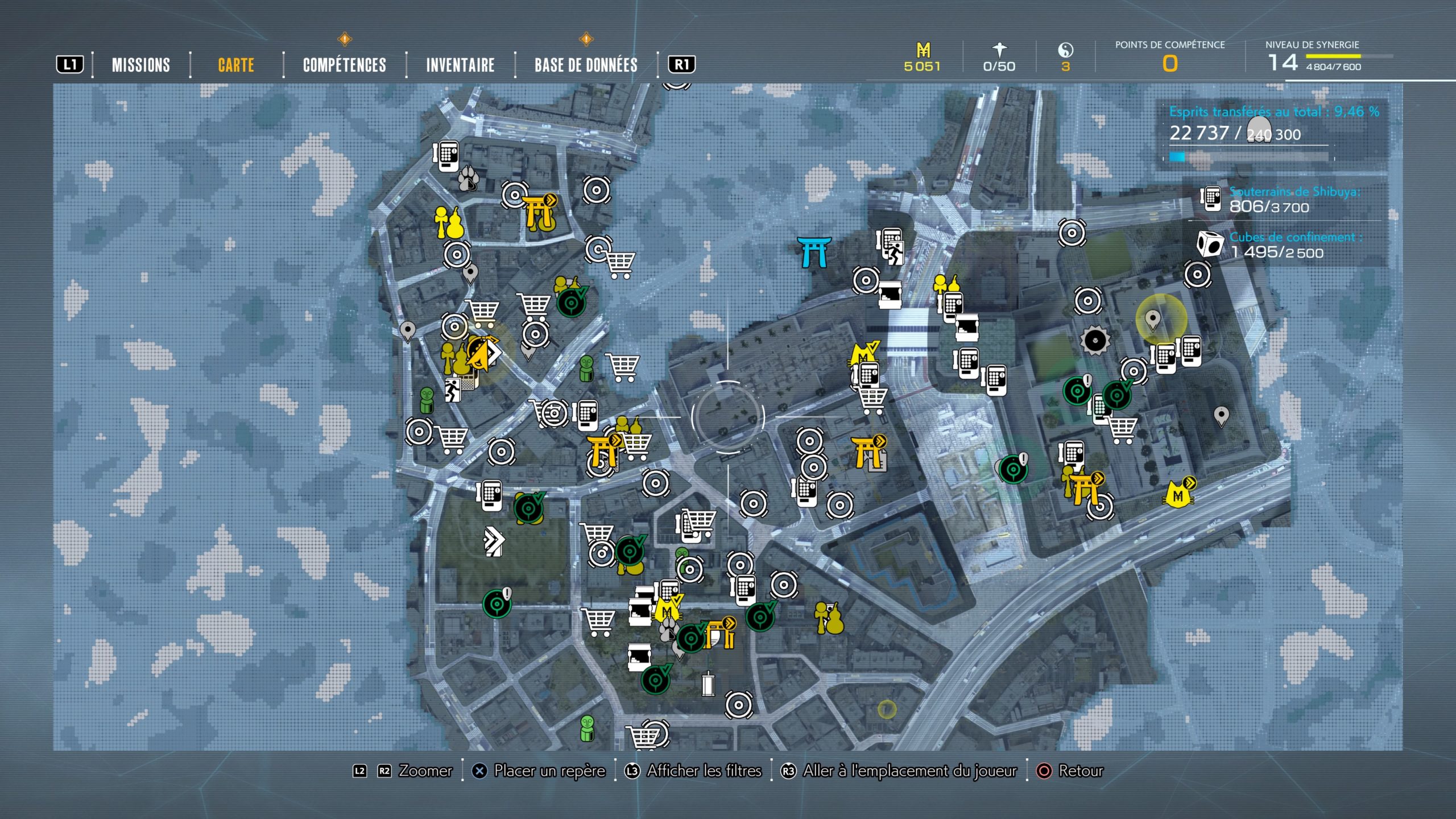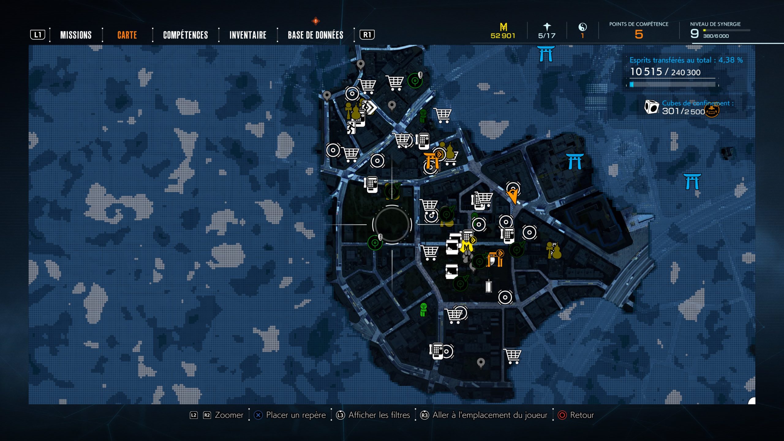 La carte du jeu utilise des icônes identifiées, avec la possibilité de zoomer. Cela évite que la masse d’information vous perturbe. Cela peut renforcer la vision en jeu et vous aider à vous repérer sur quoi faire. Les éléments en jaunes sont les éléments clés, les verts ceux des missions secondaires, les blancs les lieux utiles : boutiques pour acheter, cabines pour libérer les âmes…