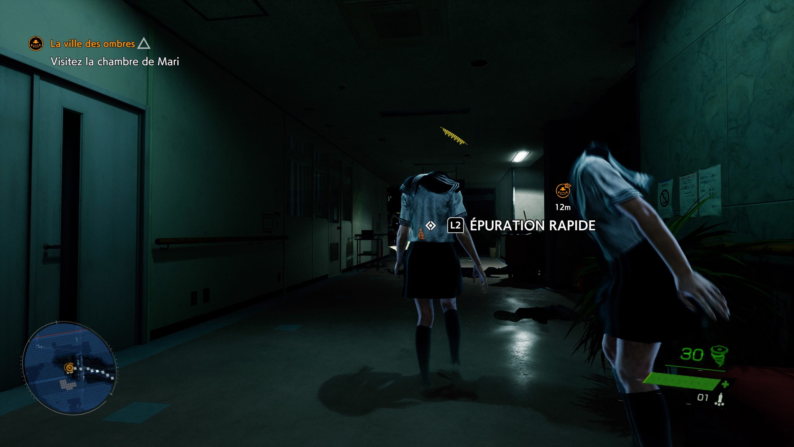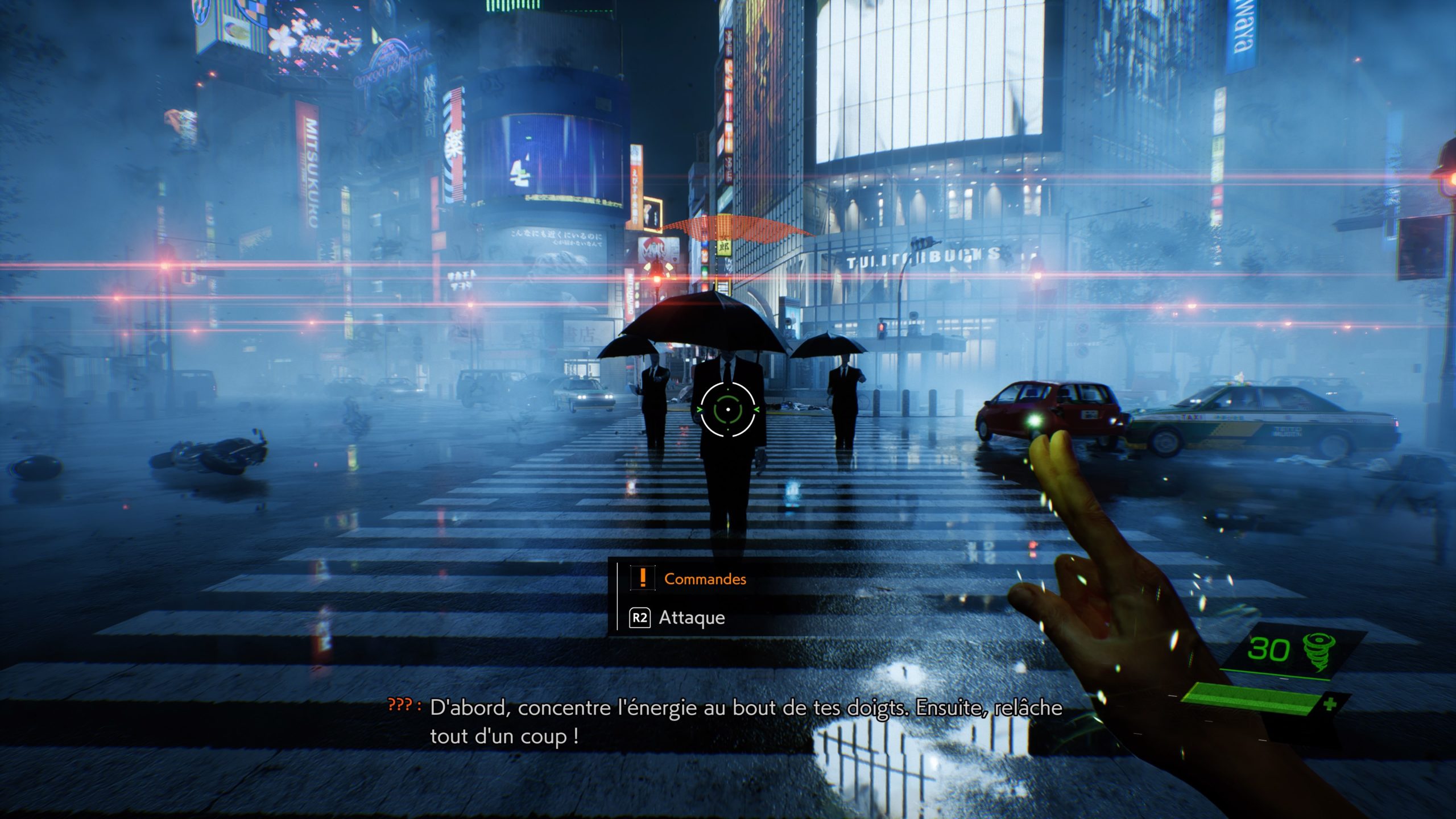 L’environnement est assez sombre malgré les éclairages de la ville pour faire ressentir cette ambiance oppressante. L’usage du blanc, pour l’interface de visée par exemple, permet de voir les items. Par contre, le pointeur de base est extrêmement petit. Regardez ci-dessous, notamment le screen droit : le minuscule point blanc au centre c’est votre pointeur.
