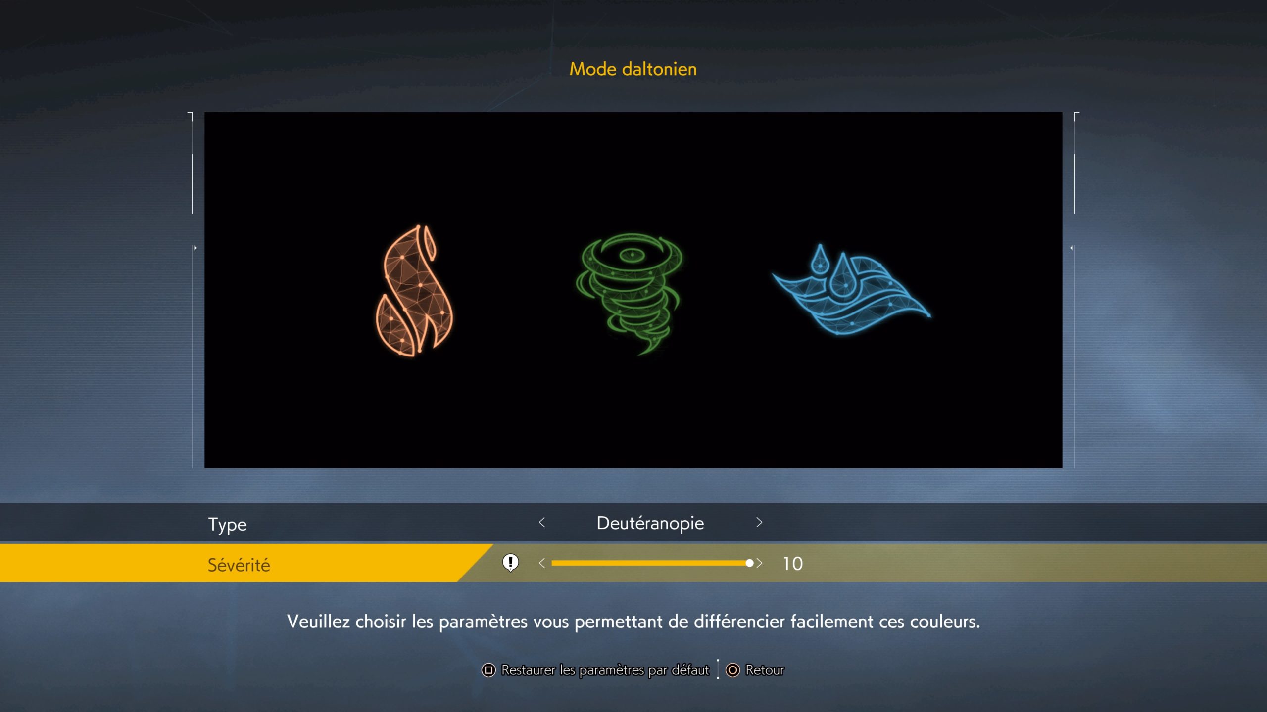 Une option de réglage vous permet de modifier ces trois couleurs aussi utilisées dans les interfaces, le vert pour les missions annexes par exemple. Vous pouvez choisir le type de daltonisme qui vous concerne, mais également sa sévérité.