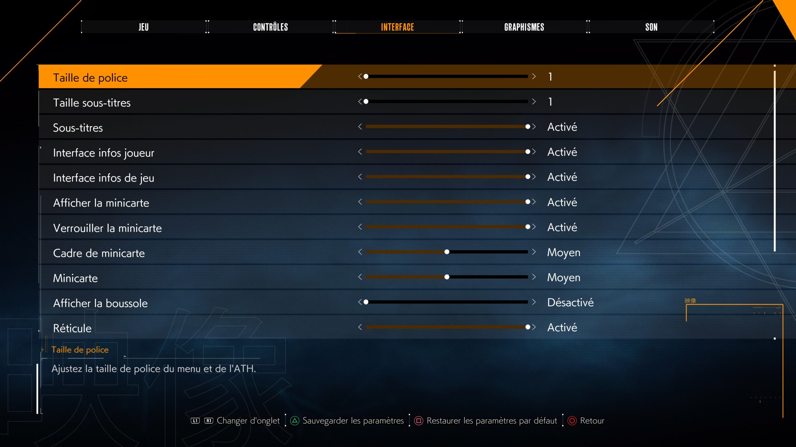 Les options vont vous permettre de régler les tailles des écrits par exemple. Des sous-titres bien sûr, mais aussi des éléments d’interface. Comme on le voit ci-dessus. Il existe un intermédiaire entre les choix « petits » et « grands » ici représentés. On peut faire de même avec d’autres éléments comme la minicarte, particulièrement appréciable. Pas de réglage des couleurs, mais l’écrit blanc est assez contrasté vu l’ambiance générale sombre.