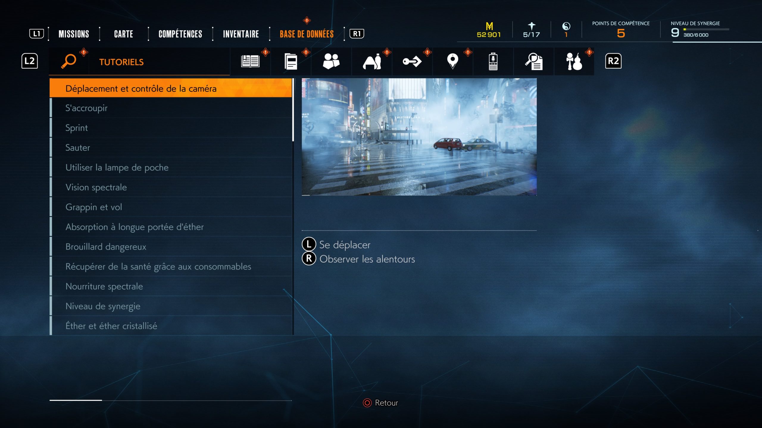 Si vous avez besoin de revoir un élément de jeu, une action. Ghostwire Tokyo a un onglet du menu dédié aux tutoriels et à la base d’information. Prenez le temps de revoir les éléments que vous n’avez pas eu le temps de bien voir en jeu.