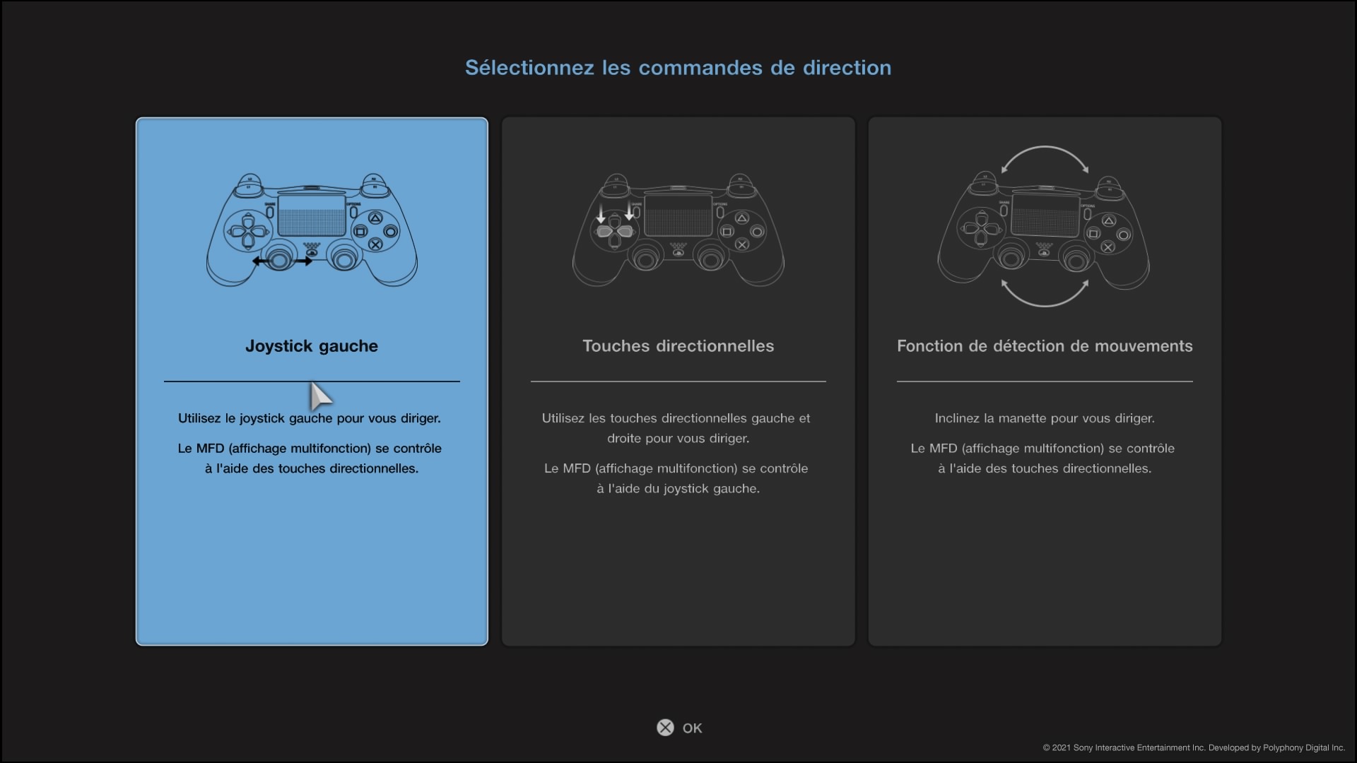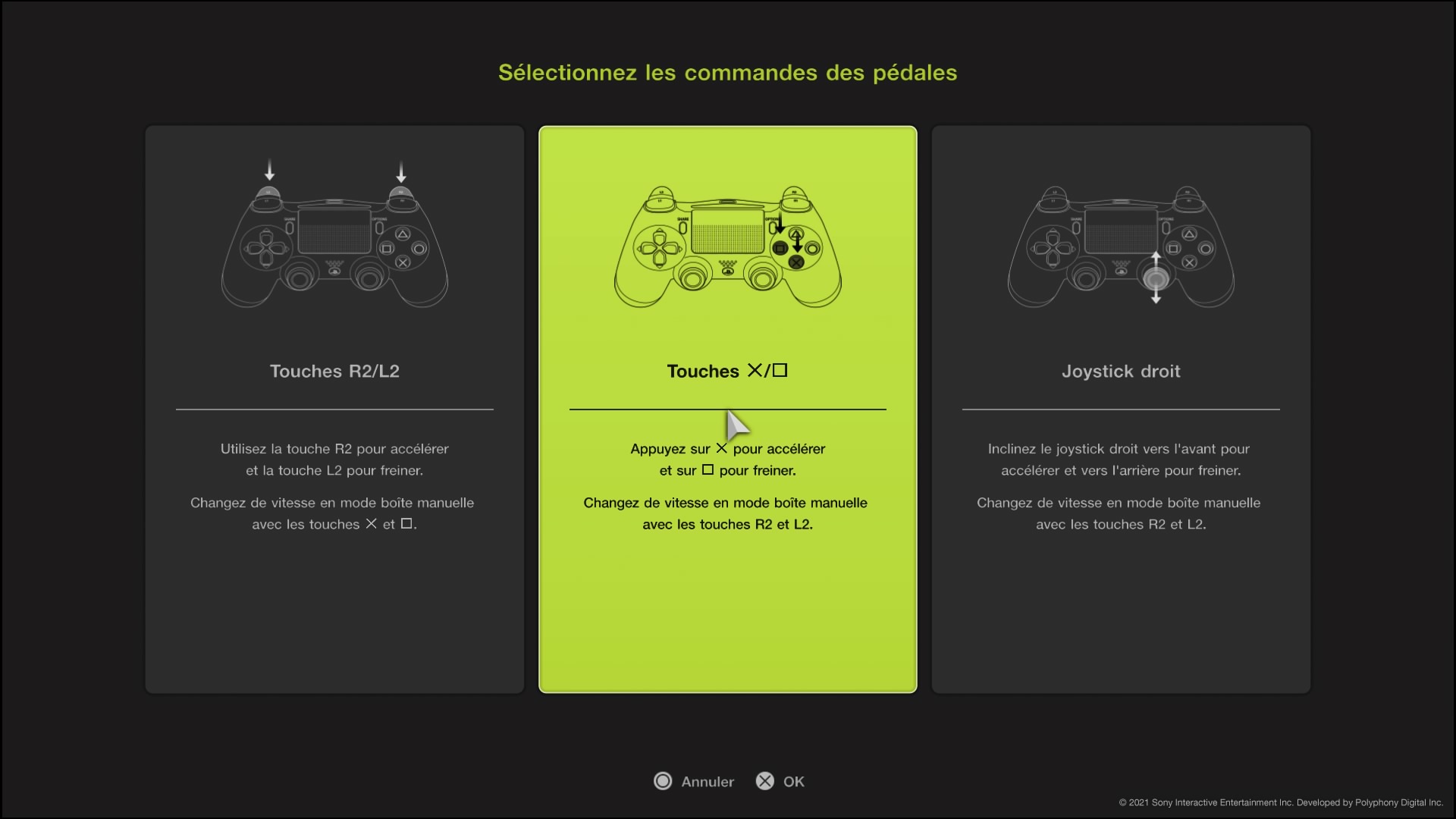 Ensuite, on vous demande de choisir comment contrôler l’accélération et le freinage. A nouveau 3 choix : avec les gâchettes, avec les boutons ou avec le joystick.