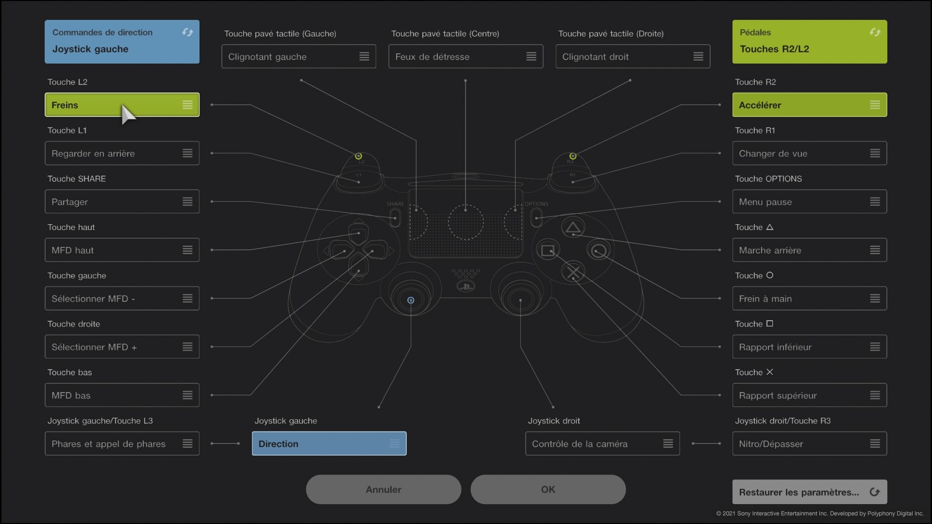 Commençons par le contrôle. Les bases consistent à maîtriser le mouvement et les trajectoires ainsi que l’accélération et la vitesse. Bien d’autres aspects vont entrer en jeu ensuite, mais c’est la base de la conduite. Sur Gran Turismo 7, après les réglages visuels, on vous propose d’entrée de régler les contrôles.