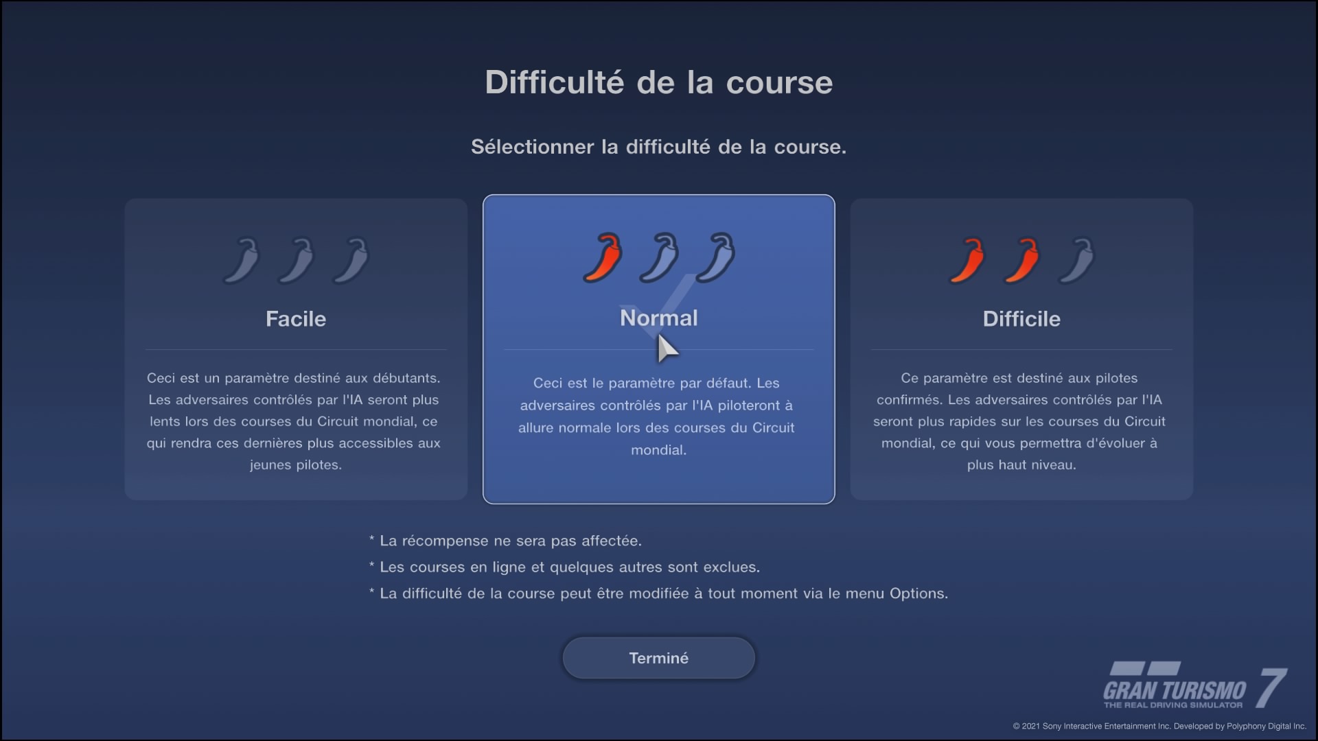 Par la suite, on vous proposera de choisir un dernier élément important du gameplay : la difficulté de course lors des courses du circuit mondial. Plus vous augmentez le niveau – entre Facile, Normal et Difficile – plus les adversaires sont rapides.