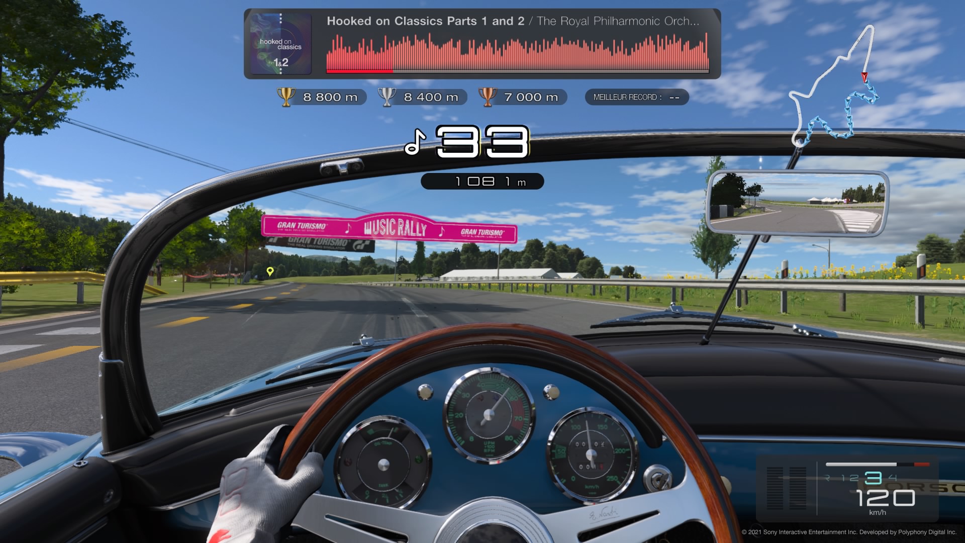 Plusieurs modes de jeu vous sont proposés. Et le premier a tout de suite séduit l’équipe : le rallye musical. C’est le mode de départ pour vous initier : une voiture, un circuit et un morceau de musique imposés et à vous de conduire jusqu’à la fin du morceau. Mais vous avez un temps limité qui est augmenté à chaque passage au checkpoint suivant. Sur le principe, le gameplay est le même – arriver au bout le plus vite possible – mais ce petit côté challenge du temps qui décompte, ça a beaucoup plu à tout le monde ! Bon ce n’est pas le jeu, il n’y a que quelques morceaux, mais ça commence bien ce Gran Turismo 7.