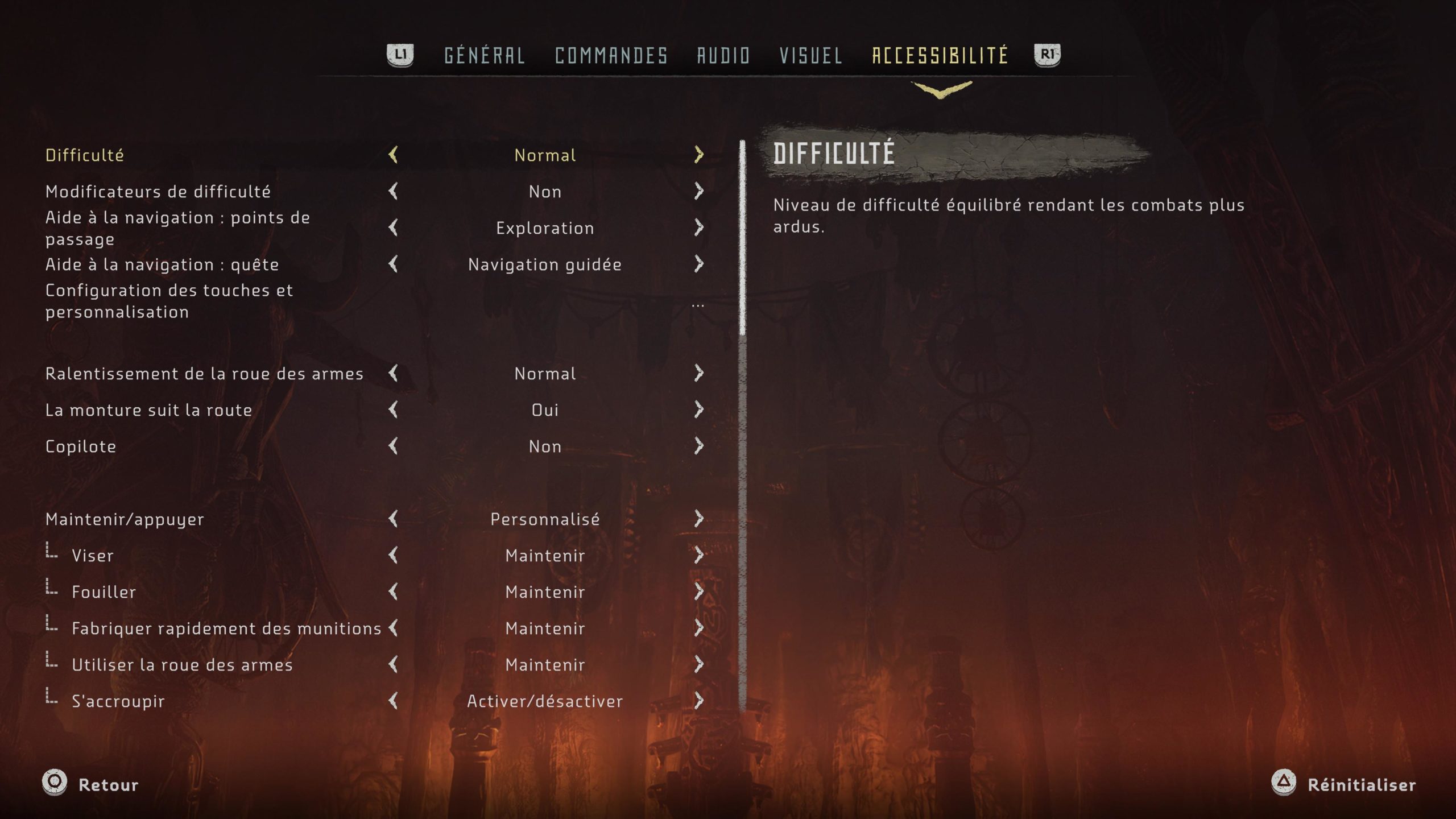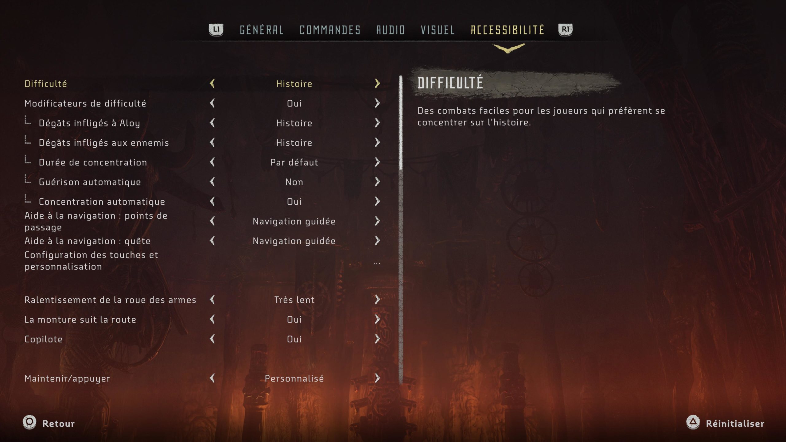 Le niveau de difficulté est un élément essentiel pour permettre à un maximum de joueurs de profiter du jeu. À cet égard, Guerilla Games propose de nombreuses options : les modes « histoire », « normal » et « difficile ». De plus, il est possible de régler indépendamment la difficulté de plusieurs éléments. C’est le cas des dégâts subis par Aloy ou ceux infligés aux ennemis. Cela offre une flexibilité accrue pour s’adapter à tous les types de joueurs.
