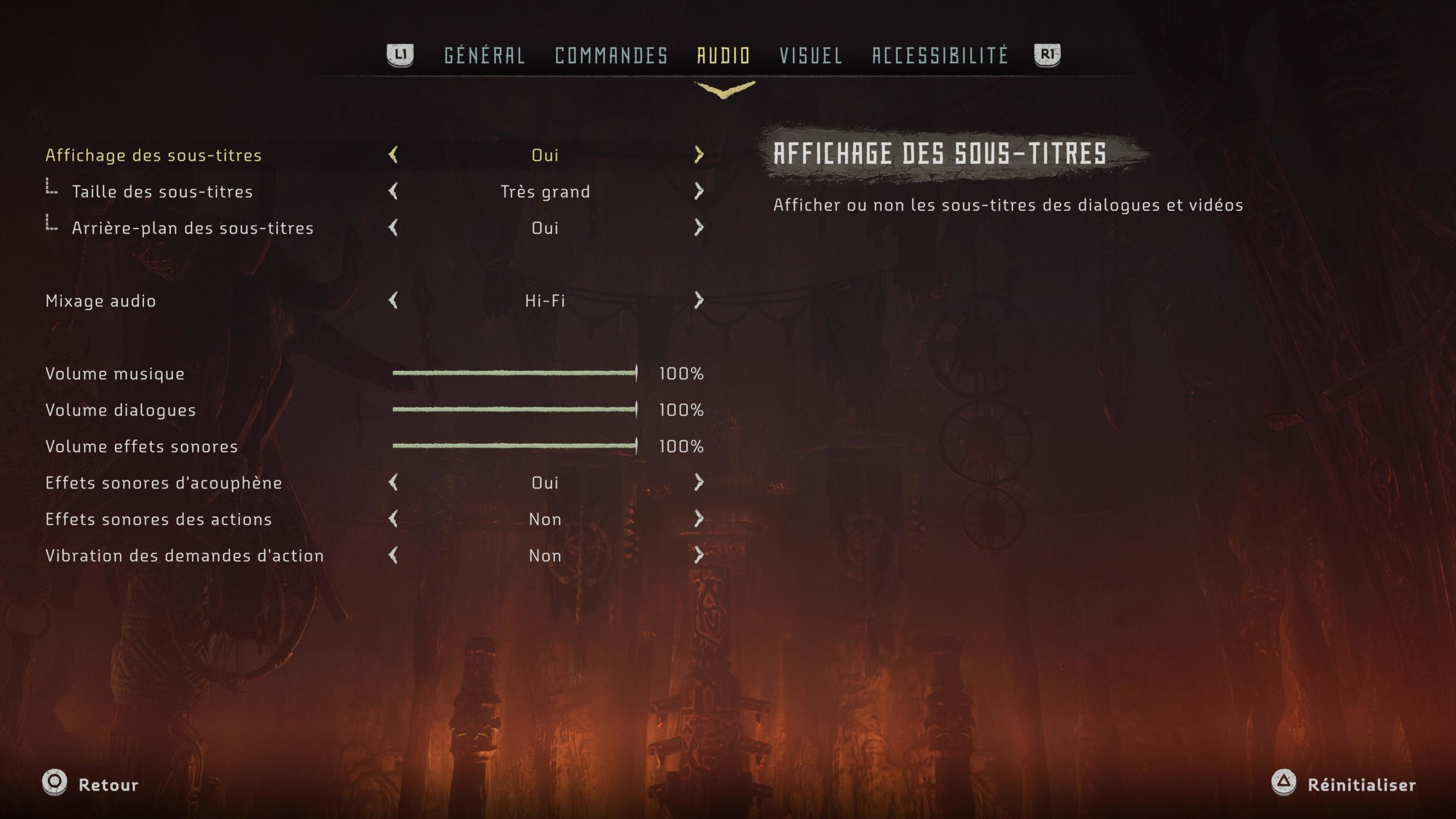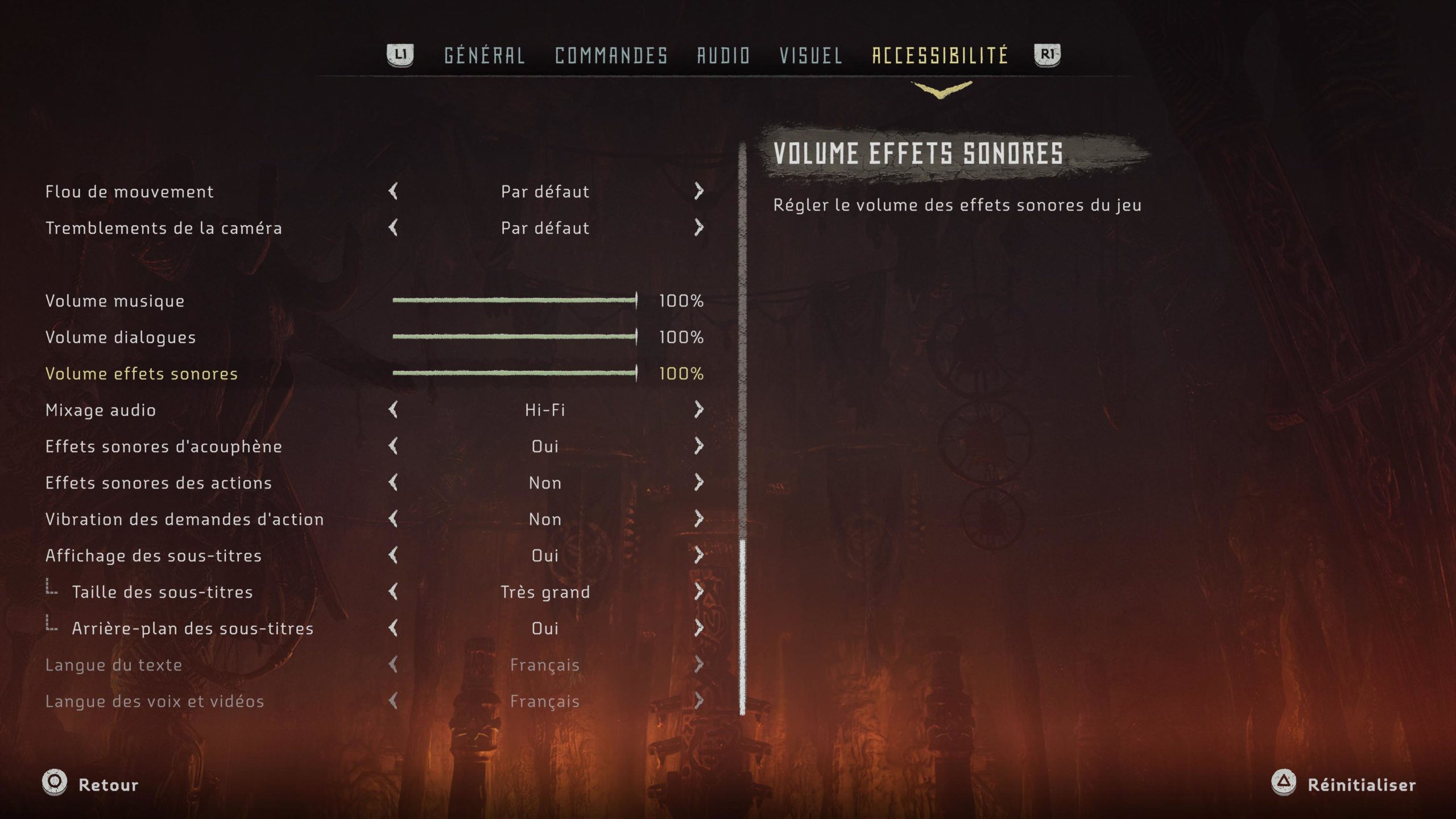 Pour faciliter l’identification de certains éléments importants, le titre propose des vibrations ajustables. Elles permettent aux joueurs de percevoir des éléments auditifs par le biais du retour haptique (PS5). Les options audio offrent également la possibilité d’ajuster différents volumes. Notamment on peut régler ceux des voix des personnages et des effets sonores, pour une expérience sonore mieux améliorée.