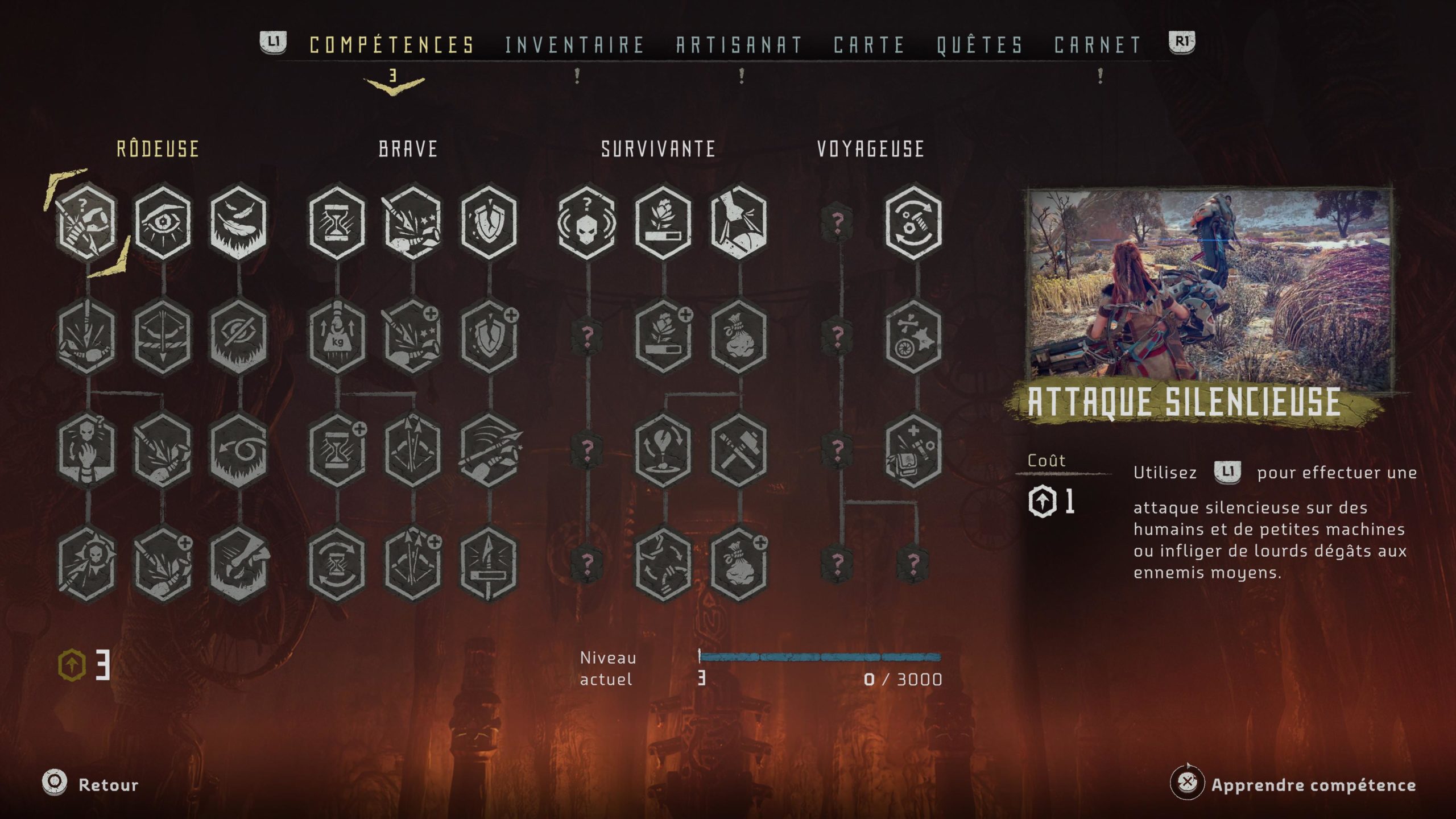 La collecte de ressources dans le monde ouvert permet d’accéder à un arbre de compétences. Celui-ci est divisé en trois catégories : furtivité, combat, et collecte et soin, offrant ainsi la possibilité de personnaliser le style de jeu d’Aloy. Les armes et tenues peuvent être modifiées pour améliorer leurs performances.