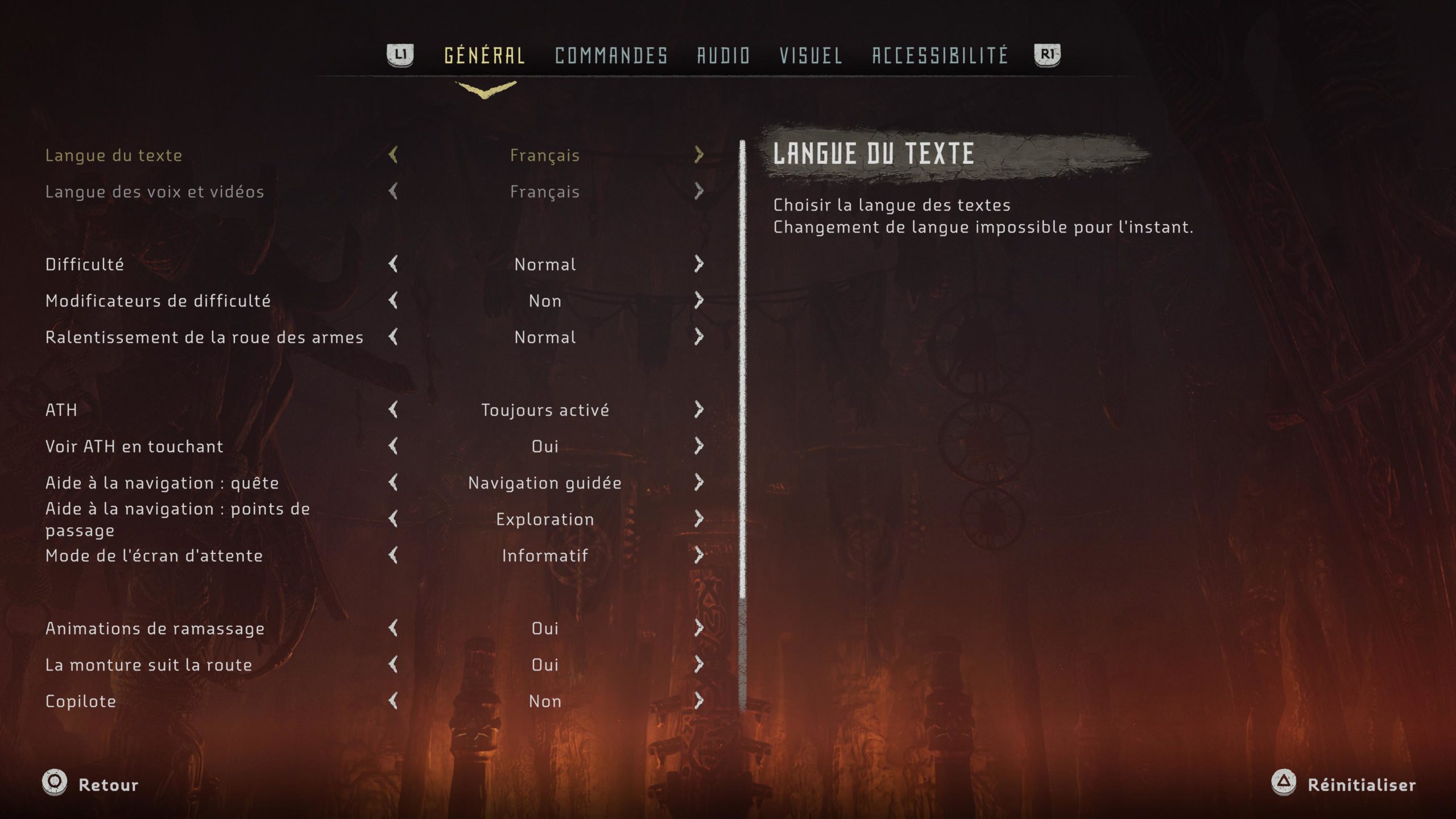Il est maintenant temps d’évaluer l’accessibilité de Horizon Zero Dawn Remastered. Ces dernières années, les jeux PlayStation Studios ont pris l’habitude louable de proposer des options d’accessibilité dès le lancement. Cependant, ce n’est pas le cas ici : les seules options disponibles au démarrage sont le choix de la langue (texte et audio), les sous-titres et le HDR. Il aurait été judicieux de proposer davantage d’options dès le début. Tous les joueurs pourraient ainsi les parcourir et les activer selon leurs besoins.