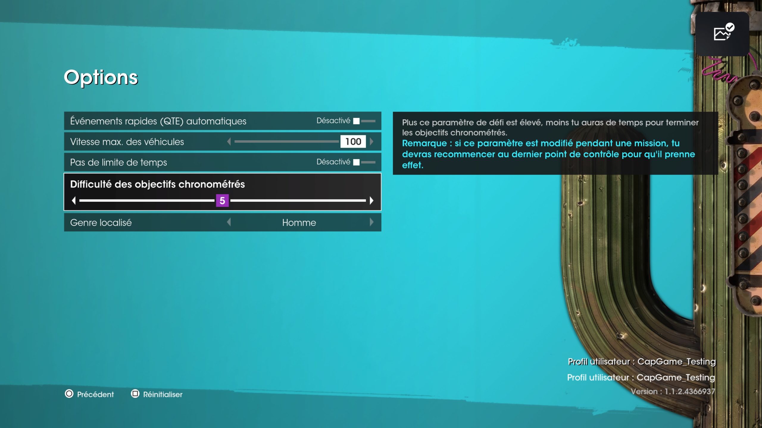 Autre bon point, c’est la possibilité de gérer les sons finement : musique dans les menus, bruits d’interface, son en jeu, réglage des voix principales ou secondaires indépendamment… Et surtout réduire ceux plus agressifs comme les explosions ou les bruits de moteur. De plus, vous pouvez gérer les éléments plus choquants comme le sang, la nudité… Une maîtrise plus poussée des informations à l’écran aurait été un bon complément, mais celle-ci reste limitée.