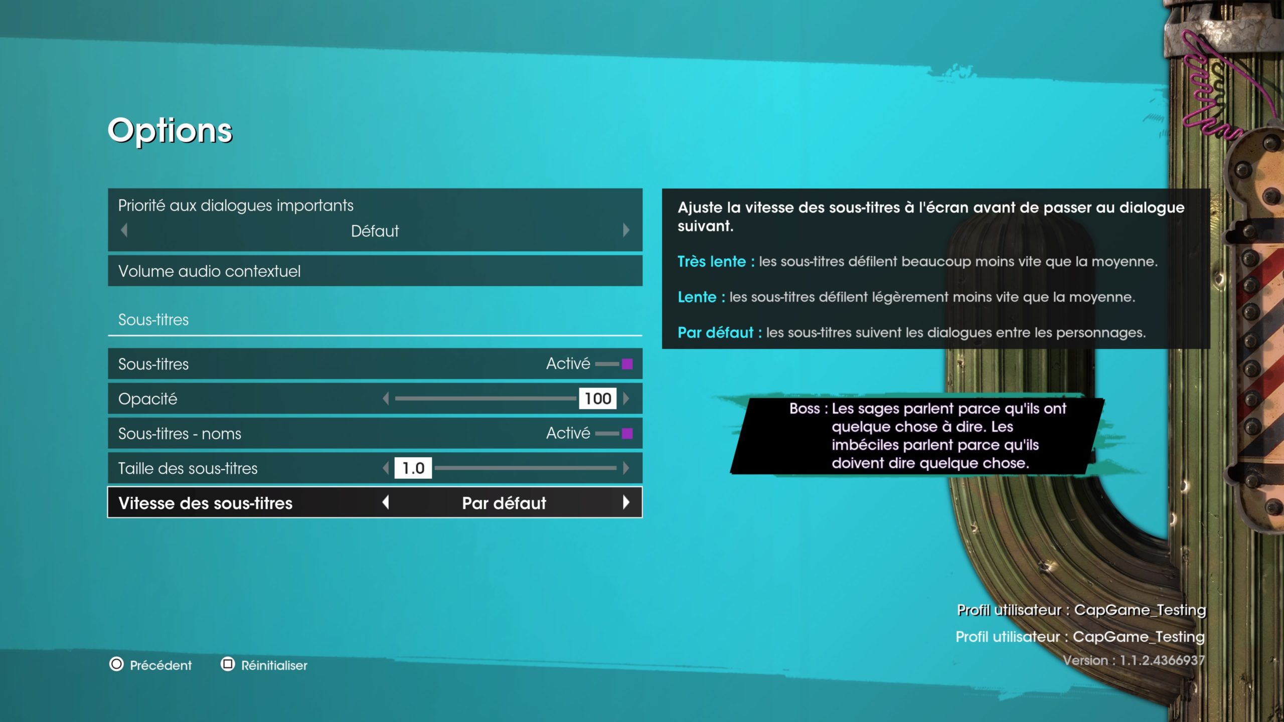 On trouve de plus en plus souvent la possibilité d’afficher le locuteur, de jouer sur la taille et sur l’opacité du fond. Et ça c’est très bon pour ne rien louper. Mais Saints Row comporte pas mal de discussions et le débit est rapide. Une option va vous aider en ralentissant le rythme des sous-titres.