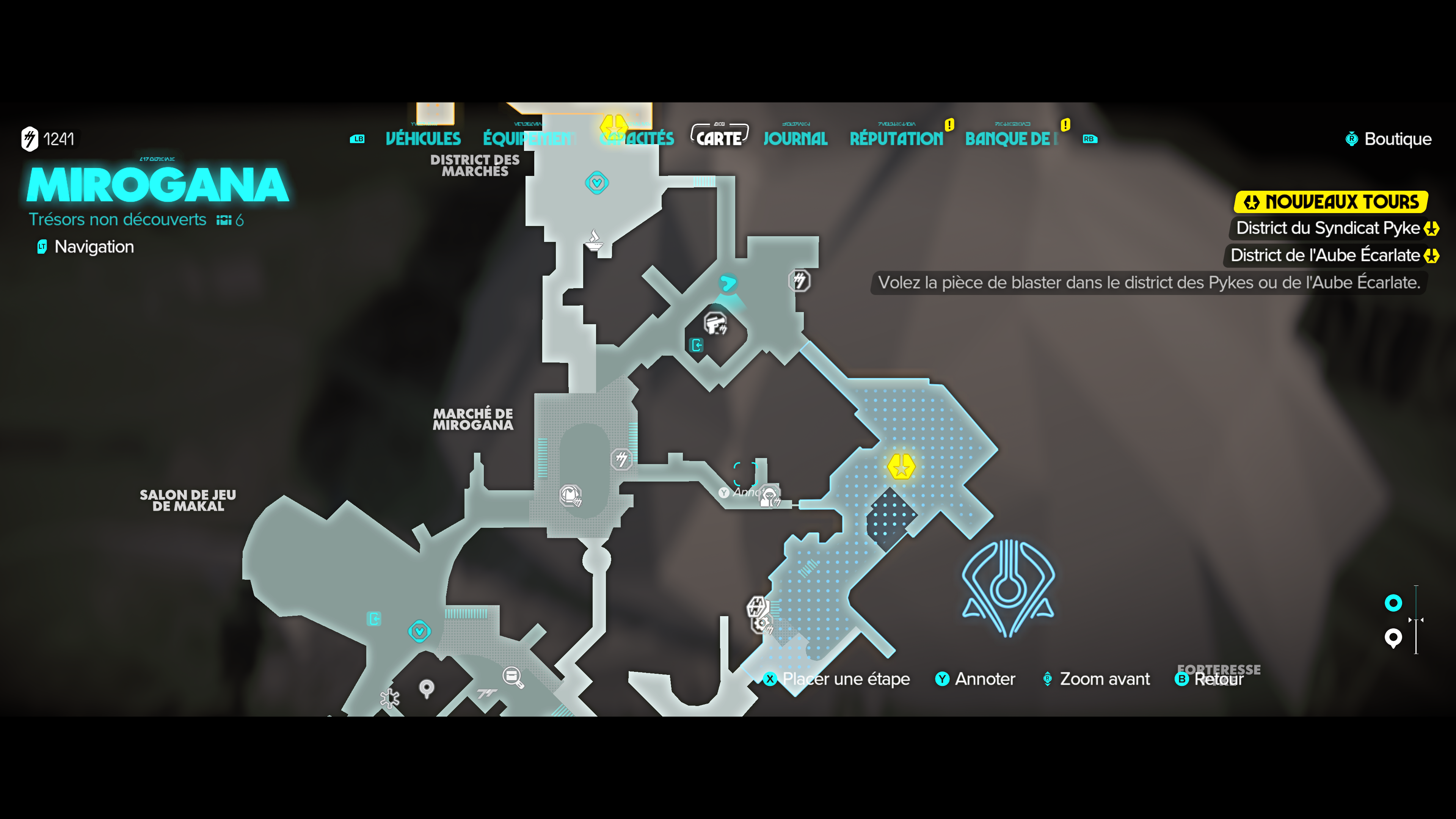 Le plus gros problème dans Star Wars Outlaws va être l’accompagnement. Les quêtes sont nombreuses. Vous pouvez en activer une à la fois dans le journal, quête principale ou secondaire, et la suivre en jeu. Une option permet d’afficher en permanence le pointeur vers l’objectif. MAIS, comme souvent, le pointeur est sur l’objectif final, même s’il est à trois kilomètres. Donc s’il y a une montagne, un fossé infranchissable ou tout autre obstacle entre vous, le pointeur reste sur la direction à vol d’oiseau.