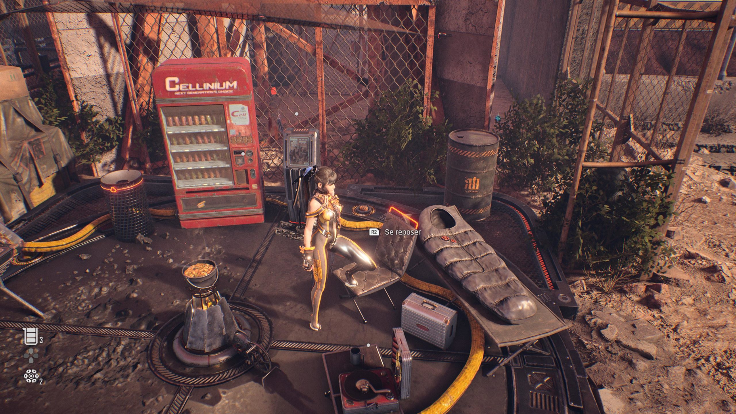 Des camps intermédiaires permettent de sauvegarder, se restaurer, s’équiper et faire évoluer votre personnage. La mort ou le repos ramène dans le dernier camp, assez proche, et réinitialise les ennemis et objets à collecter de la zone.