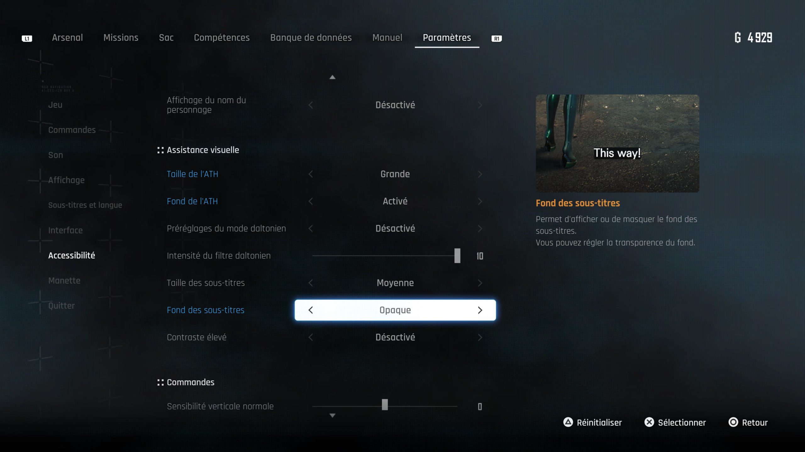 En contrepartie, les sous-titres de Stellar Blade sont réglables. On peut afficher le locuteur qui ne l’est pas de base. Vous pouvez également choisir entre trois tailles de sous-titres. Il n’y a pas par contre d’audiodescription dans ces sous-titres. On peut appliquer un fond opaque pour améliorer le contraste des sous-titres. Mais le bandeau noir est placé au ras des mots et donc peu efficace.