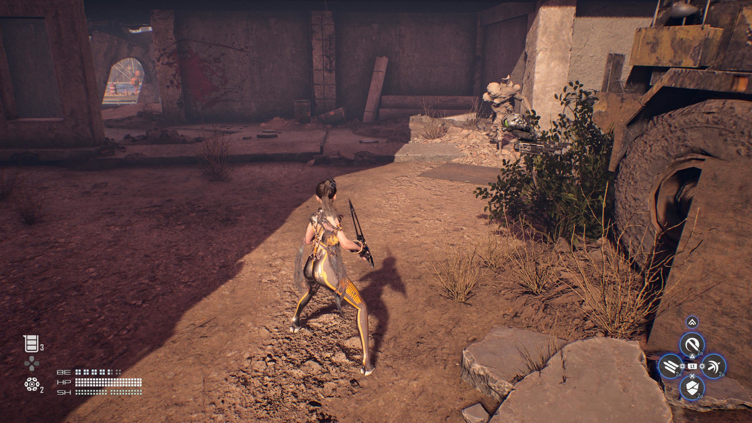 Pour ce qui est de la gestion des joysticks en combat, le « verrouillage » permet de garder la caméra sur l’ennemi, mais il saute après la mort du premier adversaire. Il faut reverrouiller, avec le L3, pour être face à l’ennemi suivant sinon la caméra ne vous suit pas. Stellar Blade propose tout de même une option « verrouillage automatique en combat », les coups ciblent tout de même l’ennemi le plus proche. Donc même si vous ne le voyez pas, vous tapez l’ennemi près de vous. Notez également qu’il n’y a pas d’assistance à la visée.