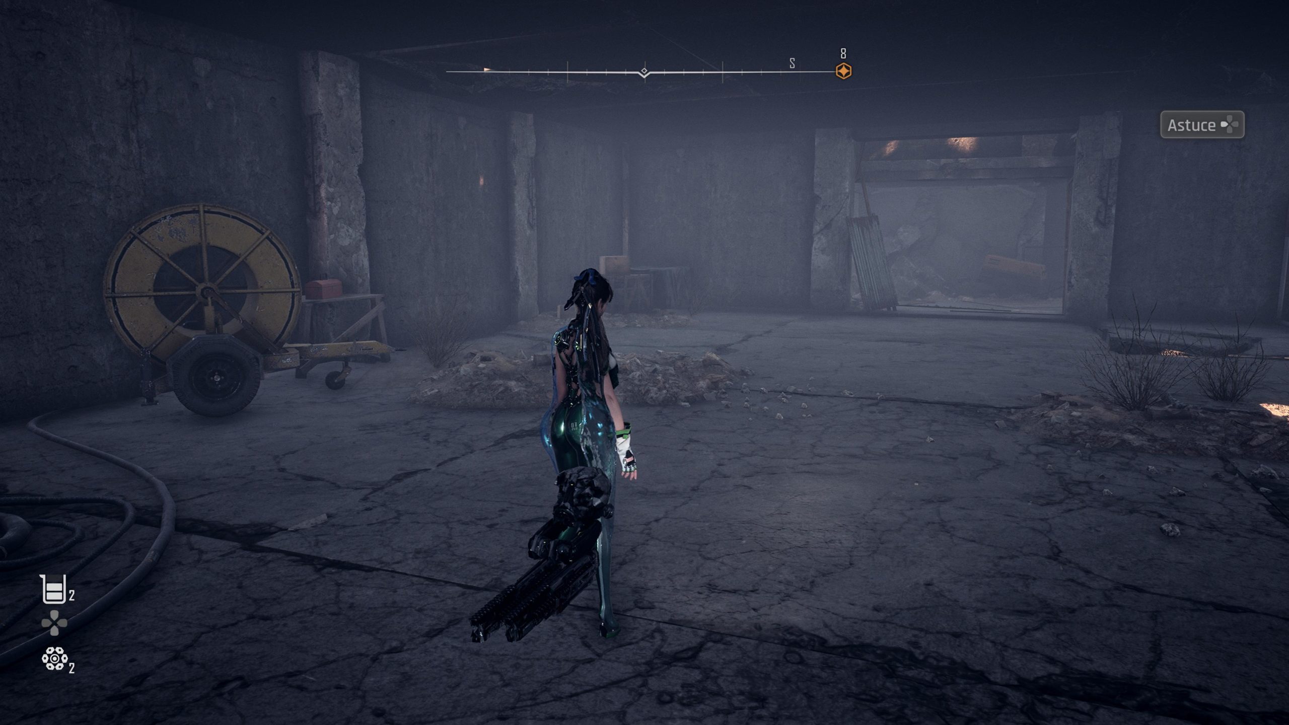 Autre mécanique de jeu, l’exploration. Déjà il faut savoir où aller. Pour ça il y a un outil en jeu : le scan. Il vous affiche une boussole avec un marqueur pour la direction à suivre. Pas de carte du tout, c’est donc le seul indicateur qu’il faut penser à déclencher souvent, puisqu’il ne reste que quelques secondes.