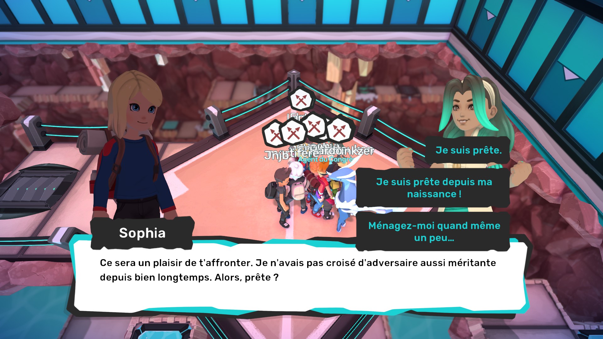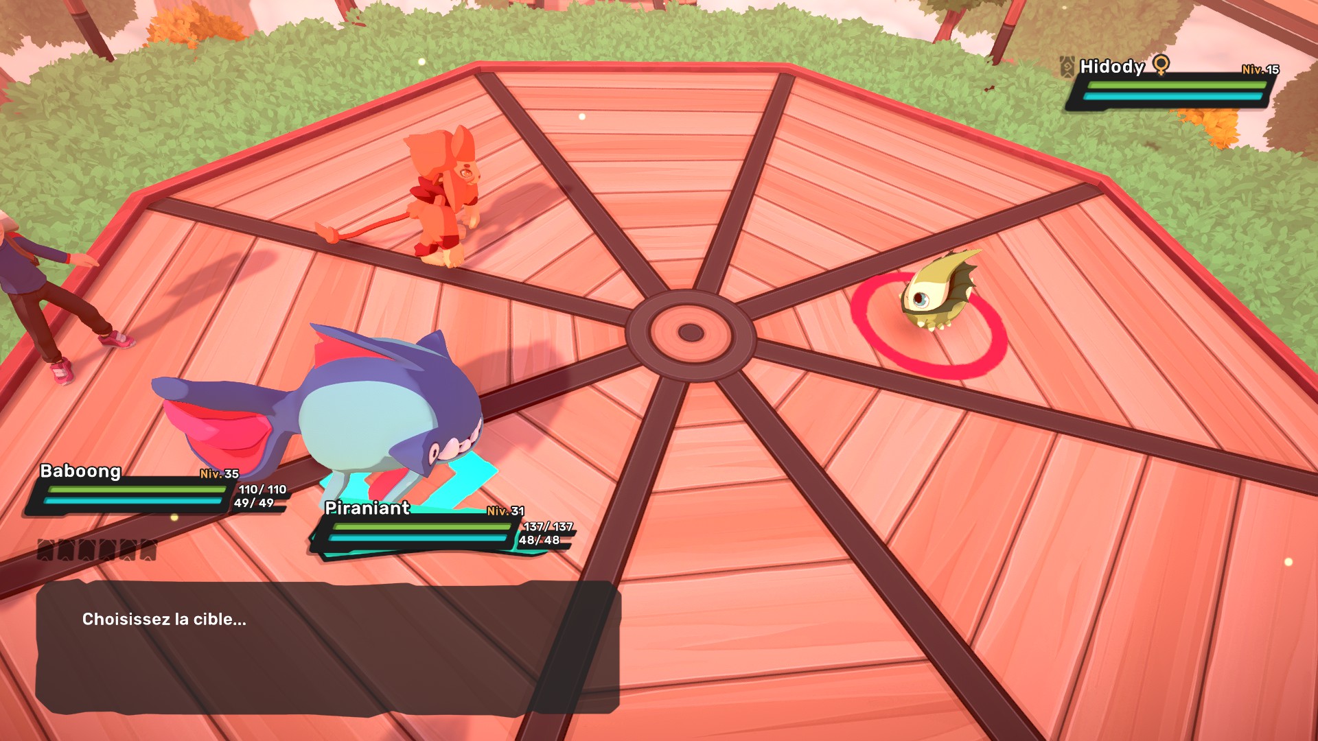 Pour les points positifs, on notera que le jeu possède des contrastes assez forts et une interface plutôt épaisse et lisible. L’interface en combat propose des boutons avec des logos ou une police d’écriture large. Lorsque vous viserez les ennemis, un cercle bien visible se présentera sous le temtem visé.