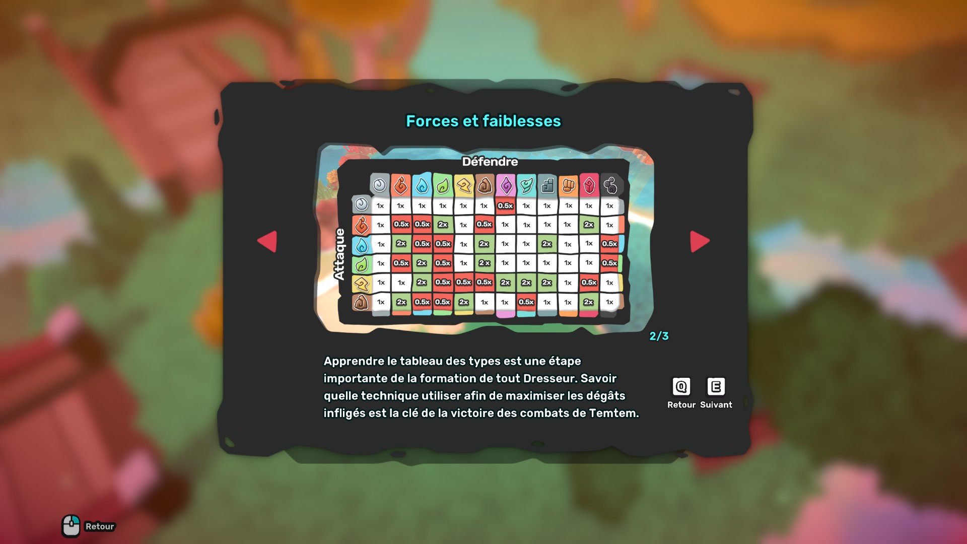 Comme pour Pokemon, le principe des types est présent. Il faudra donc apprendre que le feu bat l’eau, que l’électricité est forte contre l’air etc. Les différents types d’attaque sont associés à une couleur. Pratique et intuitif. Pour aider le joueur, lorsque vous aurez réussi à attraper un temtem en particulier, le cercle qui permet de viser le temtem adverse deviendra rouge ou vert pour vous indiquer si votre attaque est efficace contre la cible. Dommage qu’il soit nécessaire de posséder le temtem pour pouvoir bénéficier de cette aide. Le principe des types ajoute également une difficulté puisque, contrairement à Pokémon, vous ferez toujours combattre deux temstems à la fois et des synergies peuvent exister entre vos propres temtems.